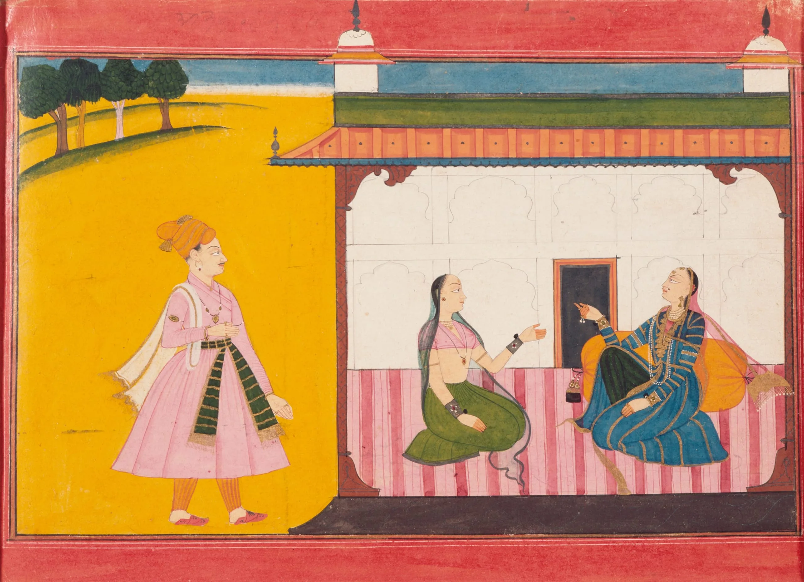 This folio illustrates the verses on the reverse describing the Rakish Lover (Adhama Vaishika) (Rasamanjari 109):