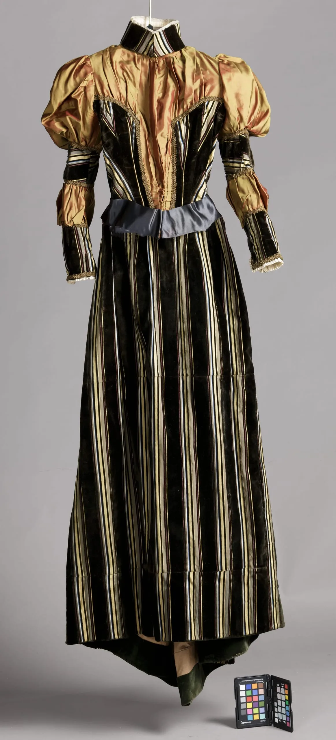 - Bodice: Silk twill with silk cut and voided velvet on twill ground, silk passementerie, and silk ribbon; Skirt: silk cut and voided velvet on twill ground