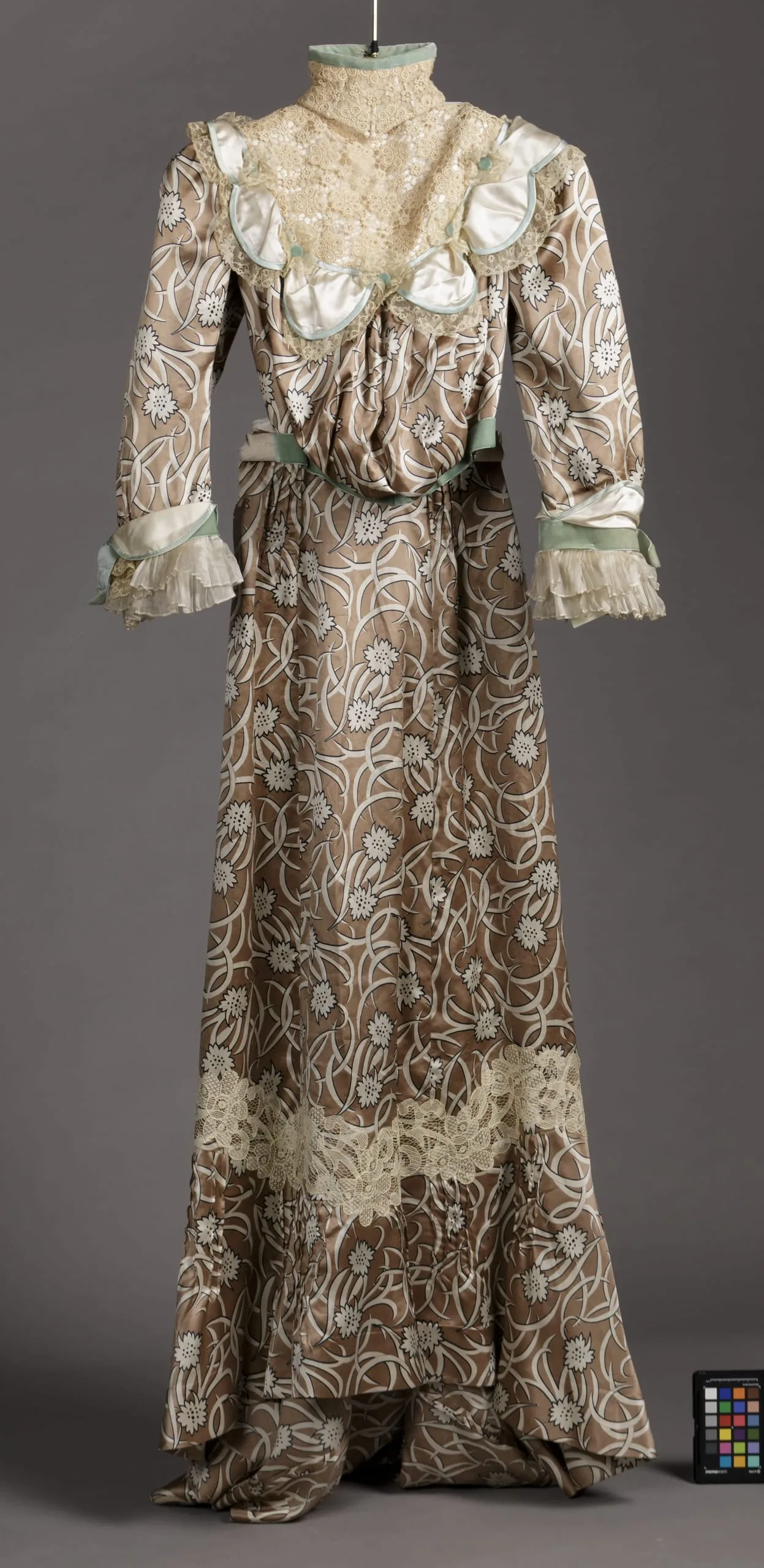 b) silk satin, printed, and linen lace