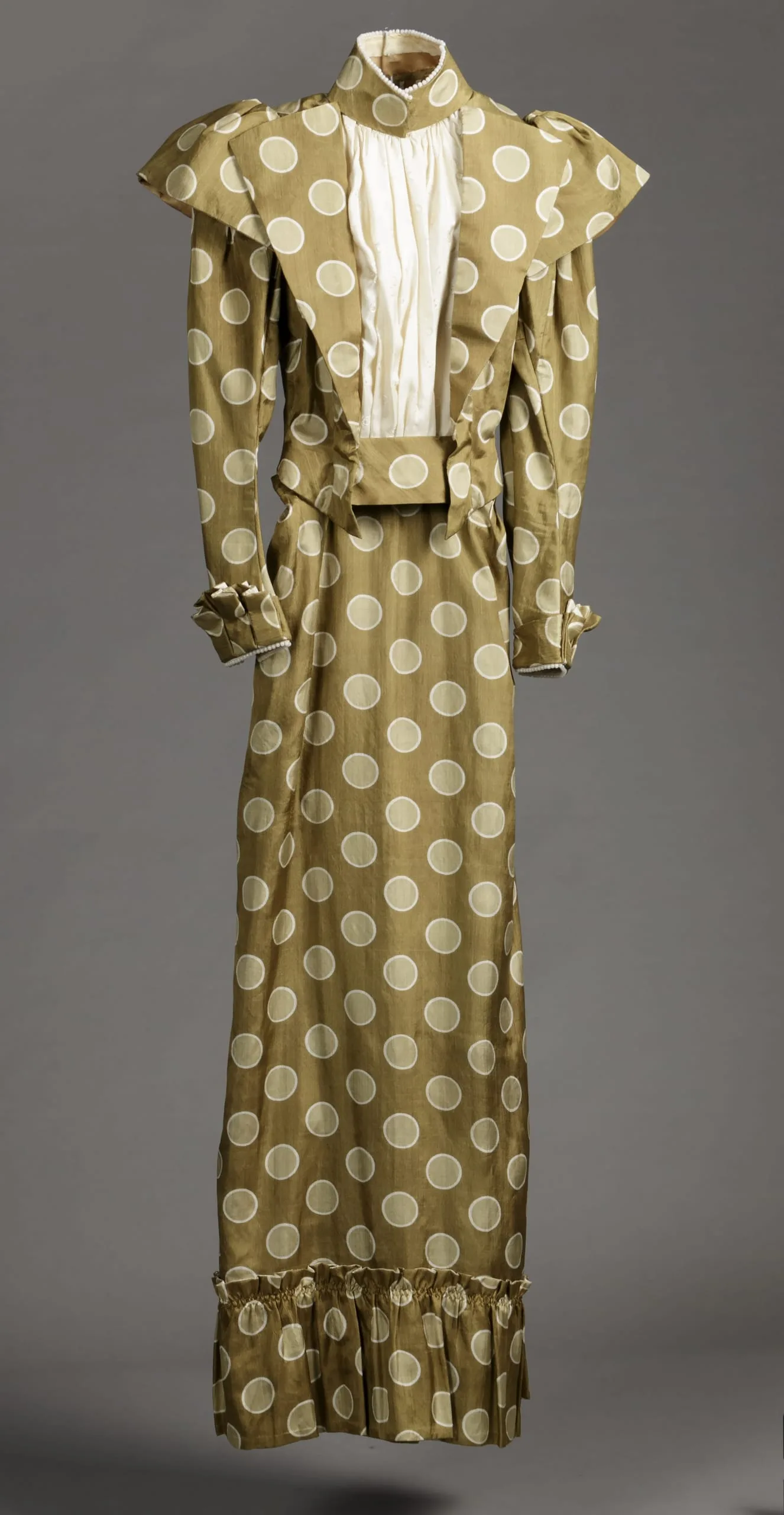 - Bodice: silk plain weave, printed, silk plain weave with supplementary weft patterning; Skirt: silk plain weave, printed