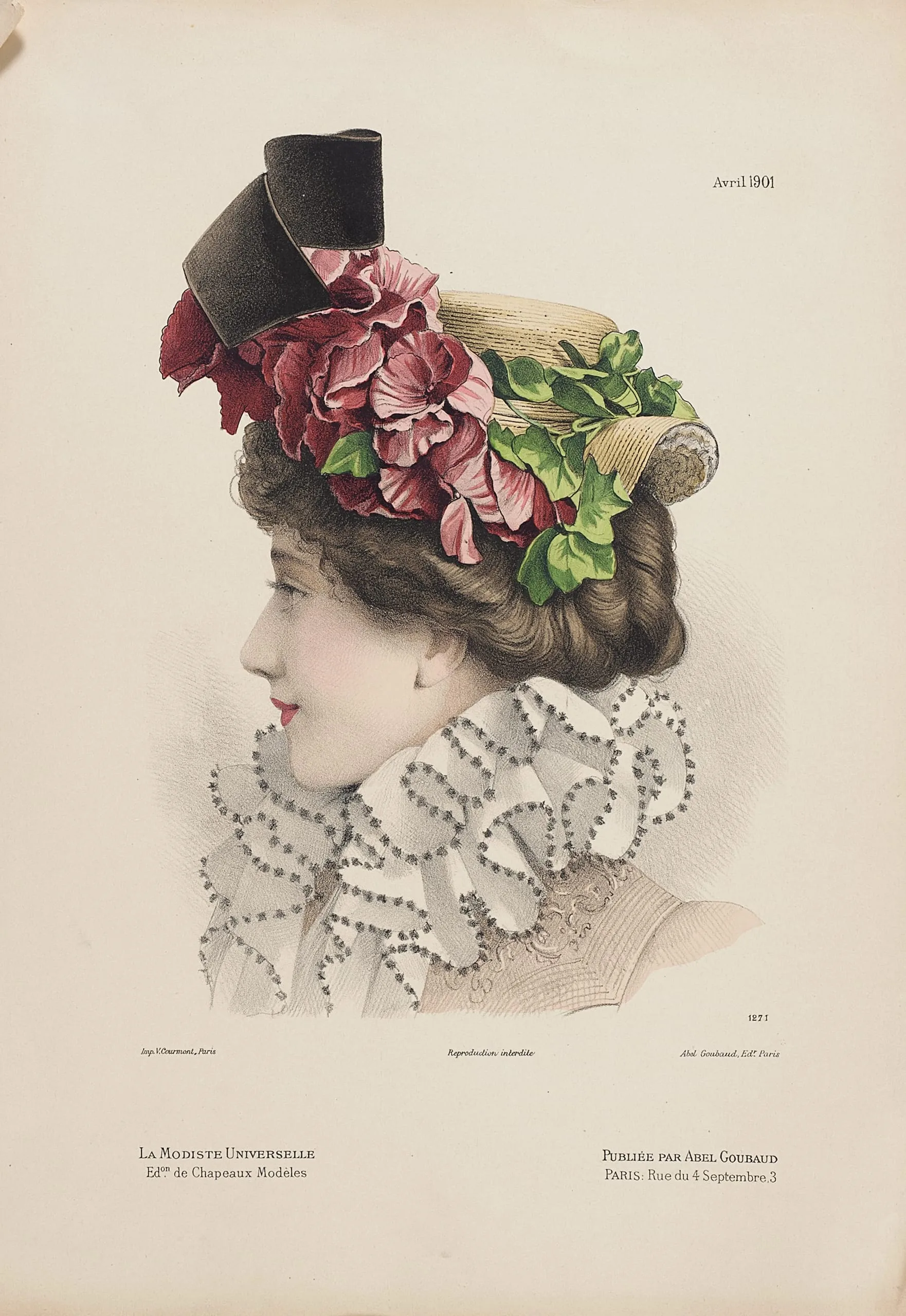 Hand-colored fashion print, woman's profile with an elaborate hat trimmed with large pink and crimson flowers and green leaves, ruffled lace collar, dated April 1901