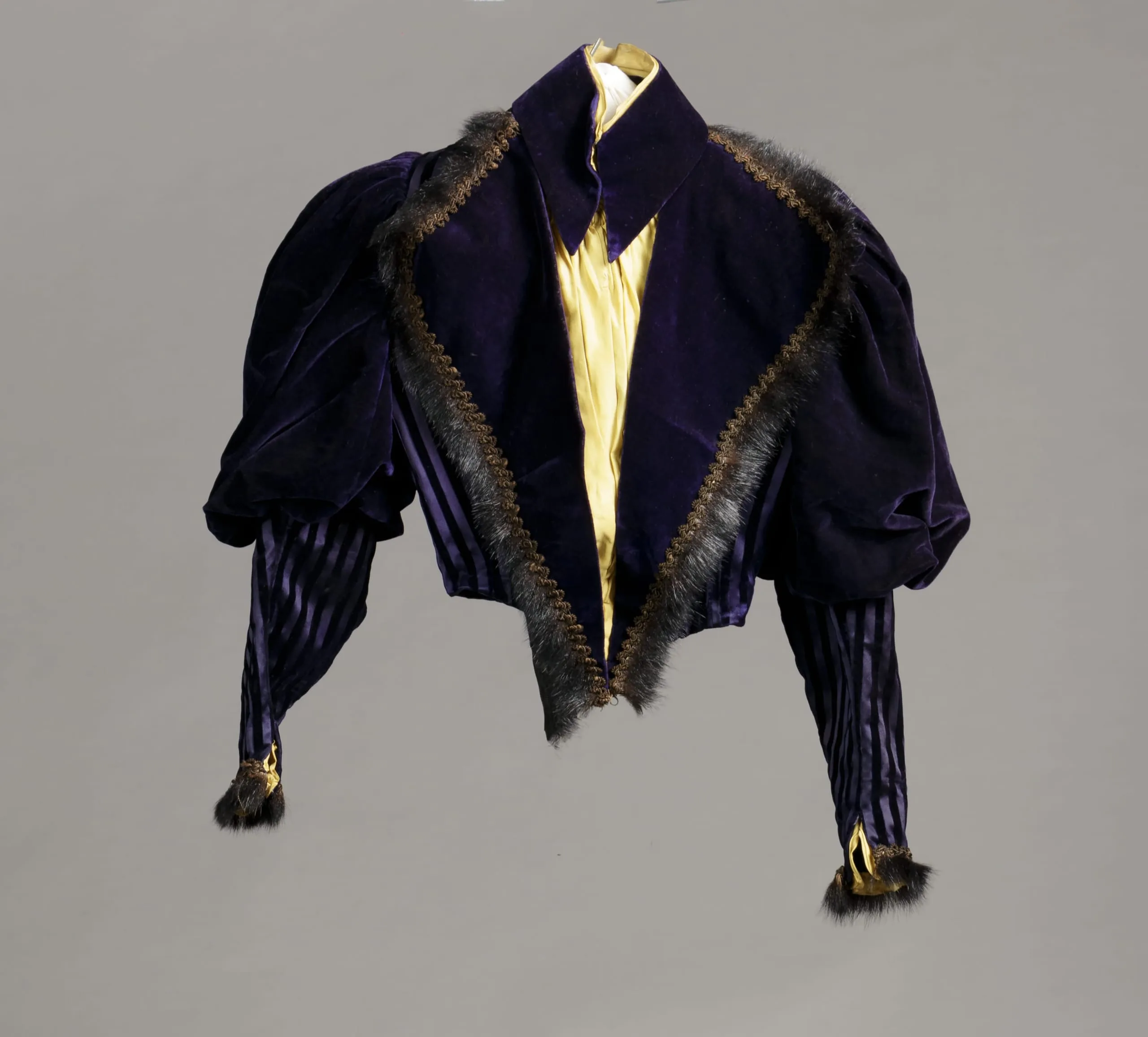 - Silk velvet, cut and voided silk velvet, silk plain weave, with silk passementerie and fur trim