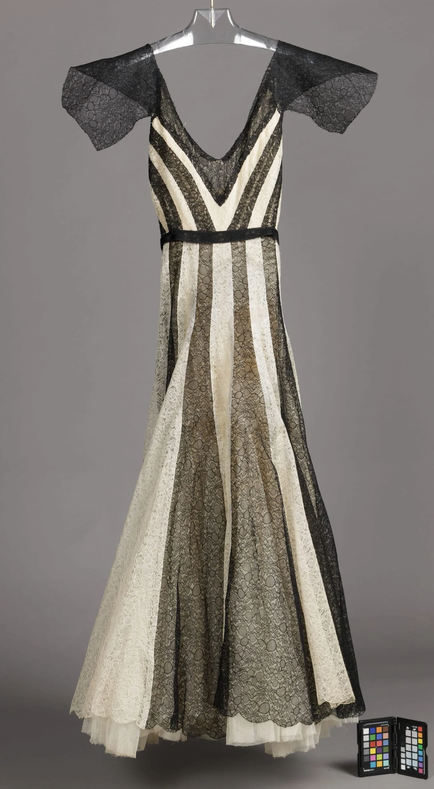 - Linen lace, silk net, and silk plain weave (crepe) with horsehair plain weave