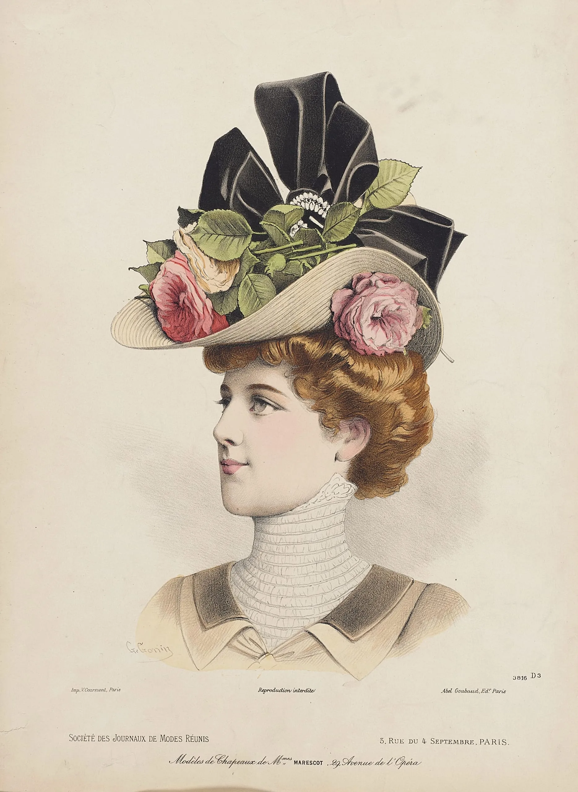 Hand-colored fashion print, woman shown in left profile wearing an elaborate straw hat trimmed with pink roses, green leaves, and a large black bow, with a tall ribbed white collar