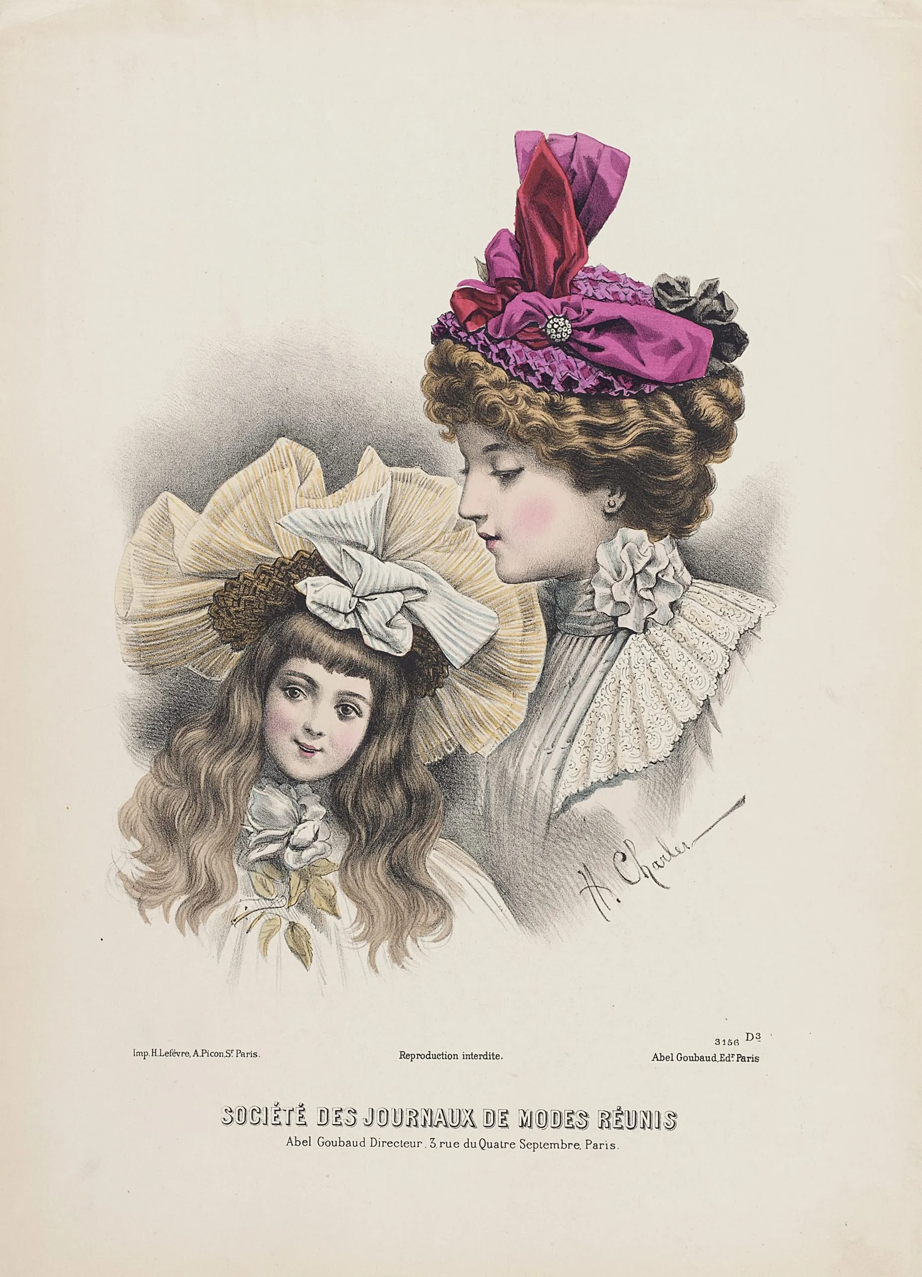 Hand-colored lithograph fashion plate showing an adult woman in profile wearing a magenta silk hat and a young girl facing forward in a large cream pleated bonnet, with printed French text below