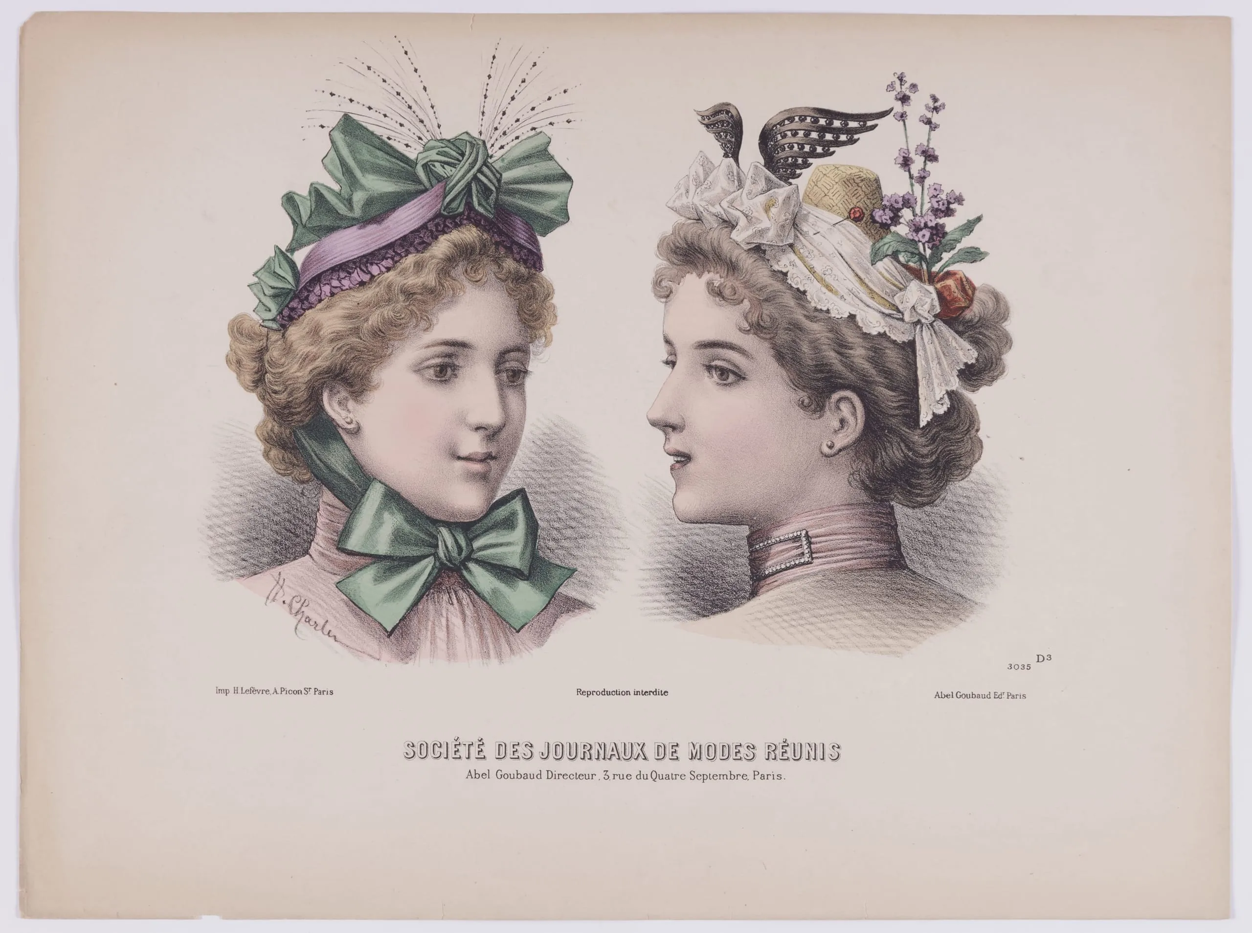 Color lithograph fashion plate showing two women in profile facing each other, each wearing elaborate decorated hats with bows, flowers, and ornaments, from a Parisian fashion journal