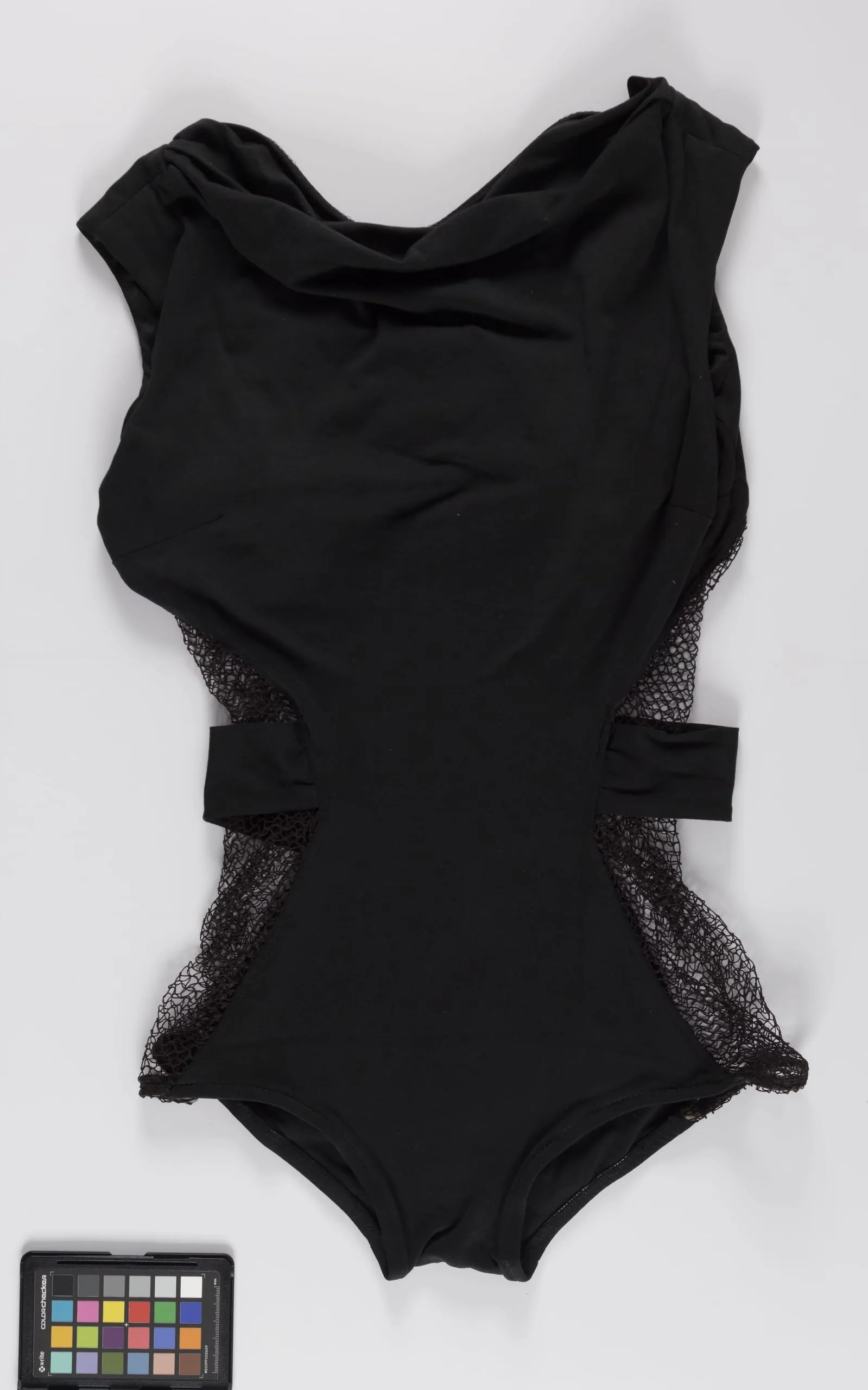 Black one-piece swimsuit laid flat, with smooth cowl-draped bodice, coarse mesh cutout side panels, and high-cut brief bottom