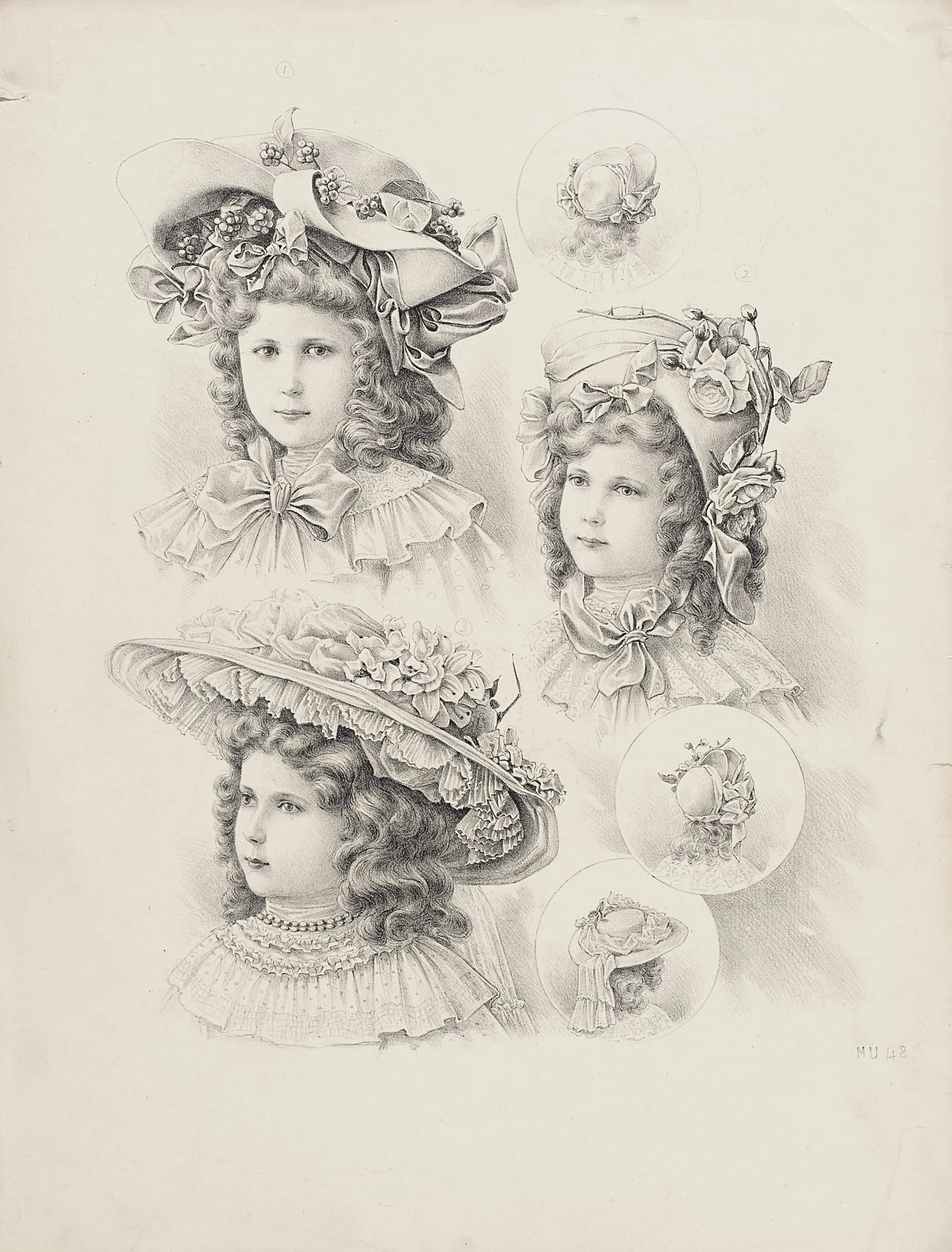 Graphite drawing on cream paper, three detailed portrait studies of curly-haired girls in elaborate ruffled hats, with four smaller hat studies in vignettes along the right side