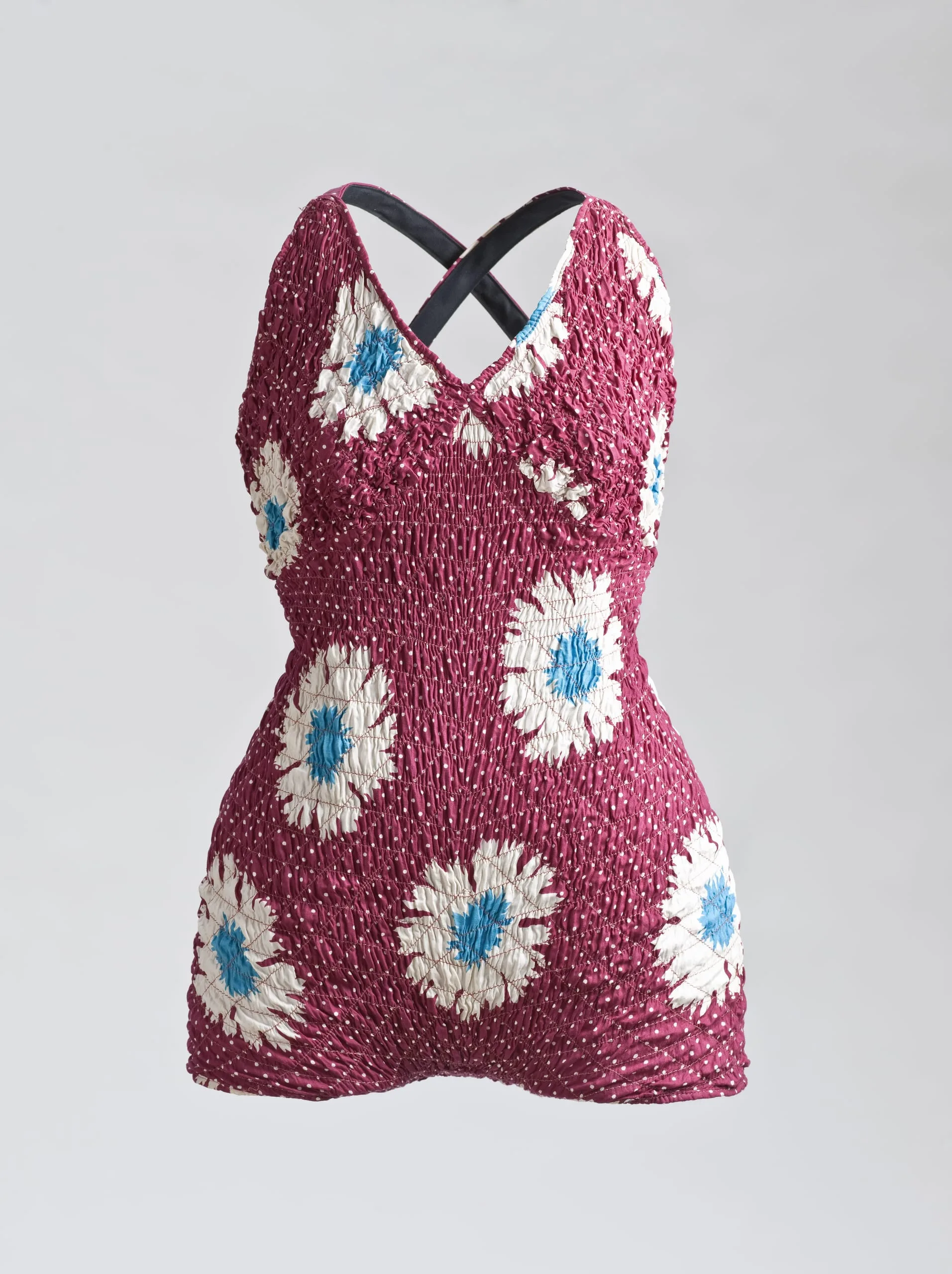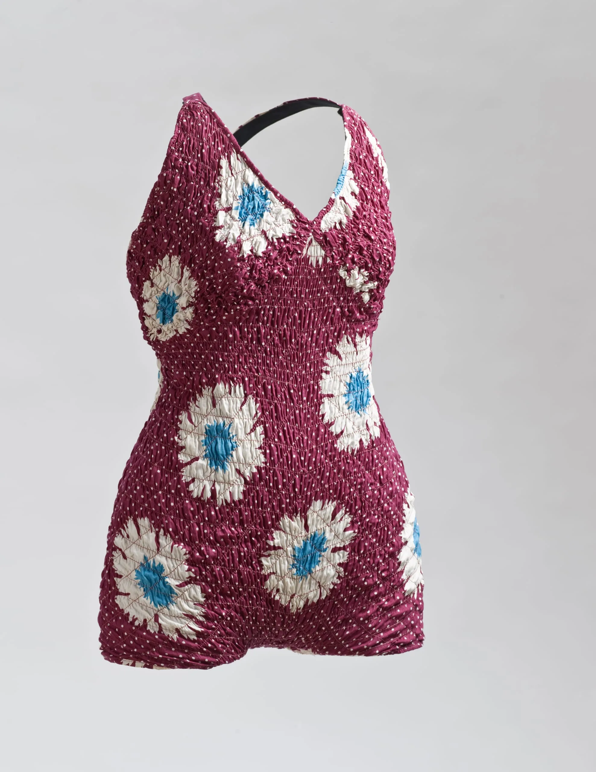 Having begun his career with an underwear company, West Coast Knitting Mills, Fred Cole introduced glamour and sophistication into women’s swimsuits by changing the style, cut, and weight of knits previously used for undergarments. His head designer, Margit Fellegi, further revolutionized the swimwear industry in 1936 with the “Matletex” process of shirring cotton on elastic thread. For the first time, swimsuits that hugged the body like knits could be made in floral and geometric prints in brilliant “California” colors.