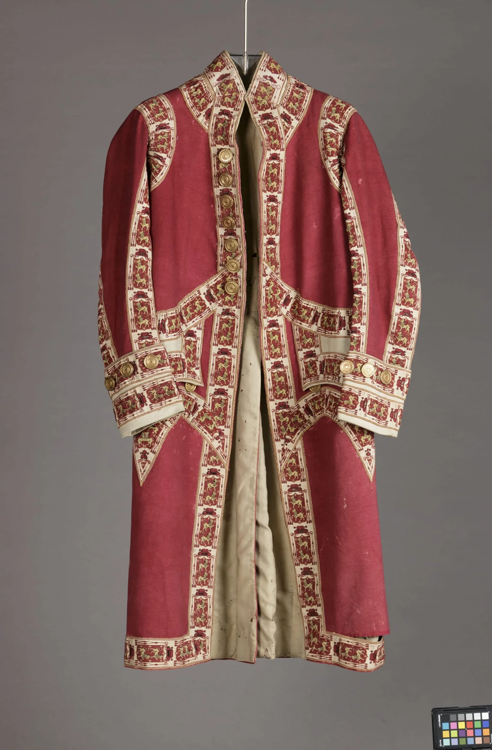 - Wool plain weave, fulled, with silk uncut and voided ribbon and metal buttons