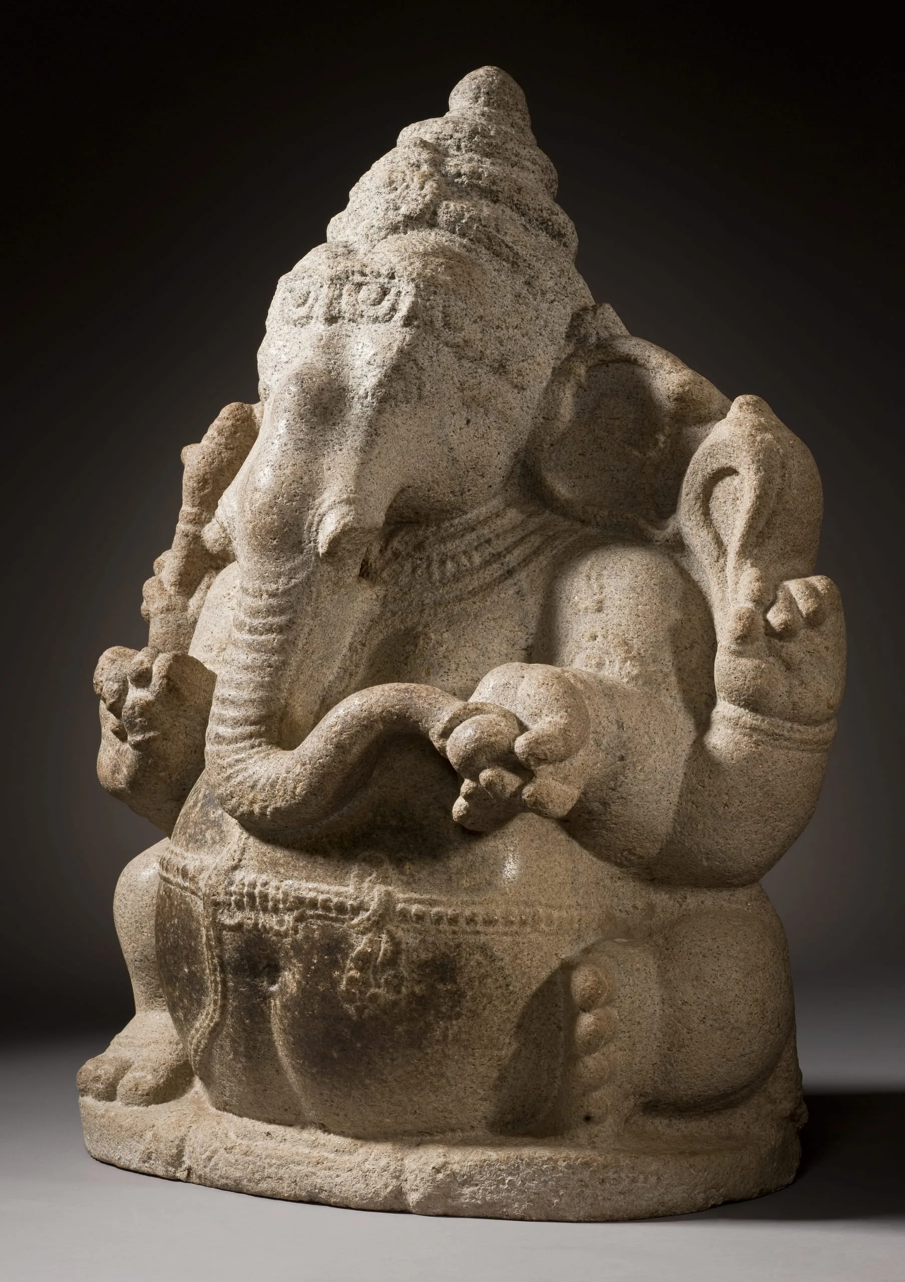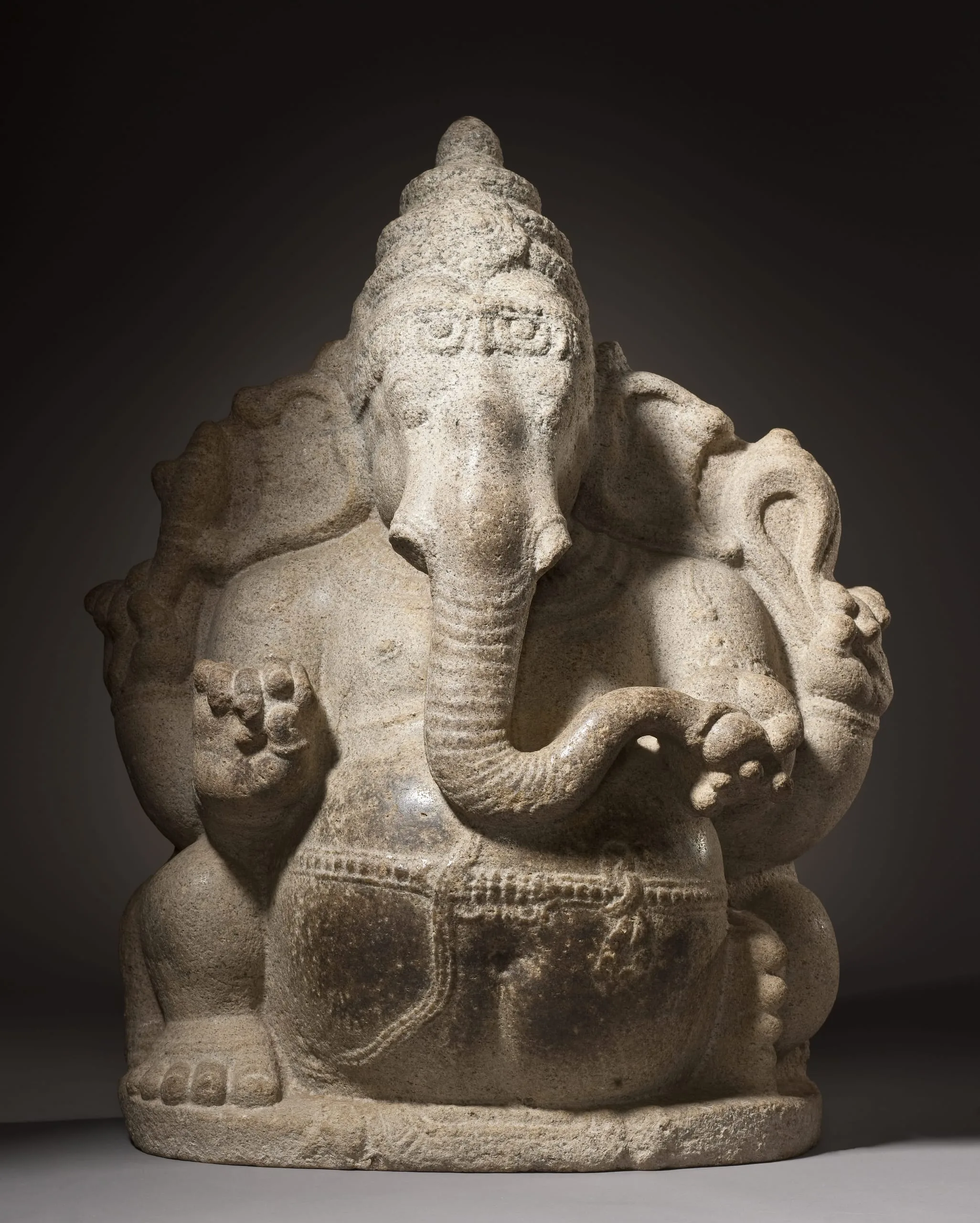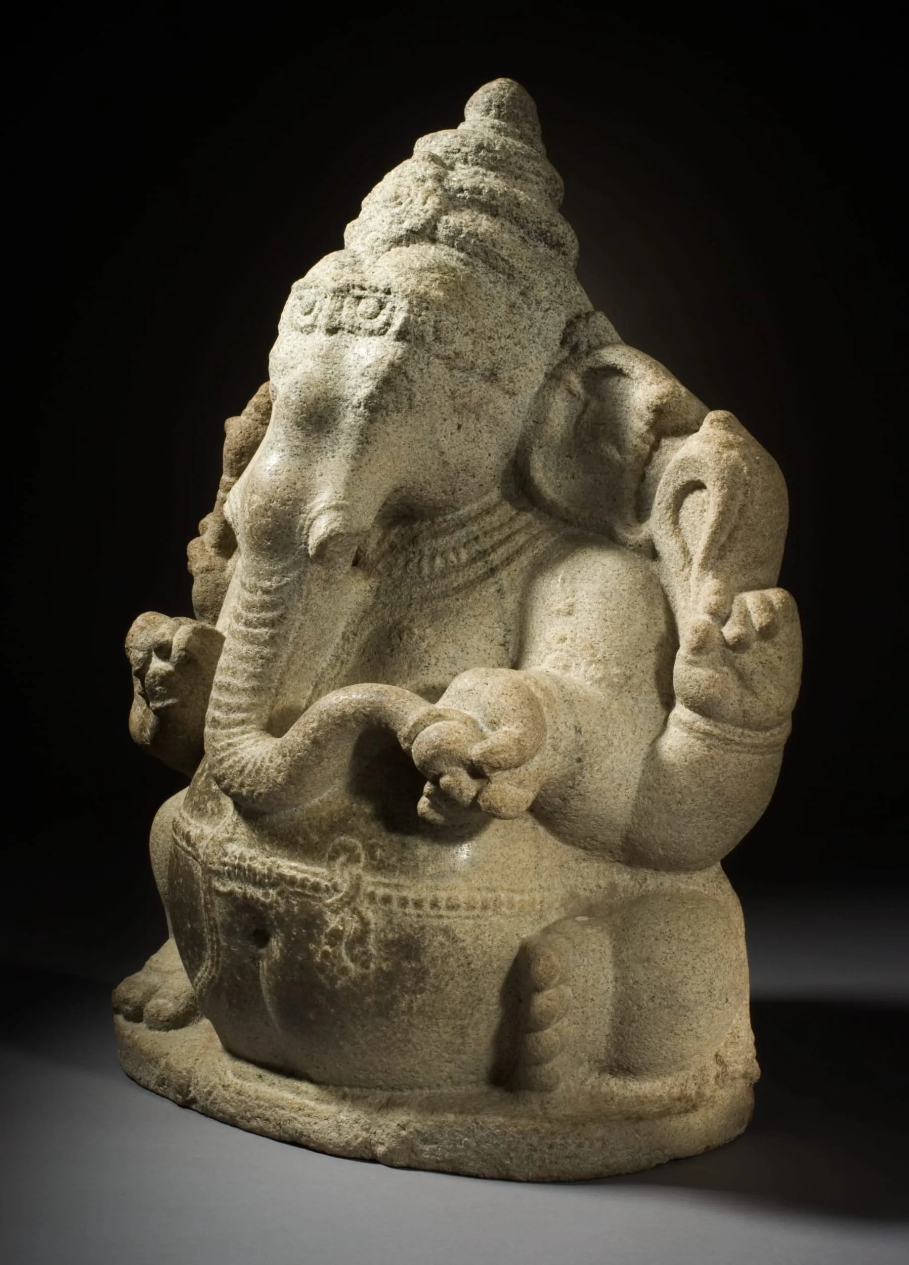 Ganesha holds a battle axe in his upper right hand, his broken tusk in his lower right, a noose in his upper left hand, and a sweetmeat in his lower left that he is about to pick up with his trunk. The sculpture has a dark patina on his belly from being rubbed for good fortune. The backside of Ganesha’s body is fully articulated and has a pronounced swayback.