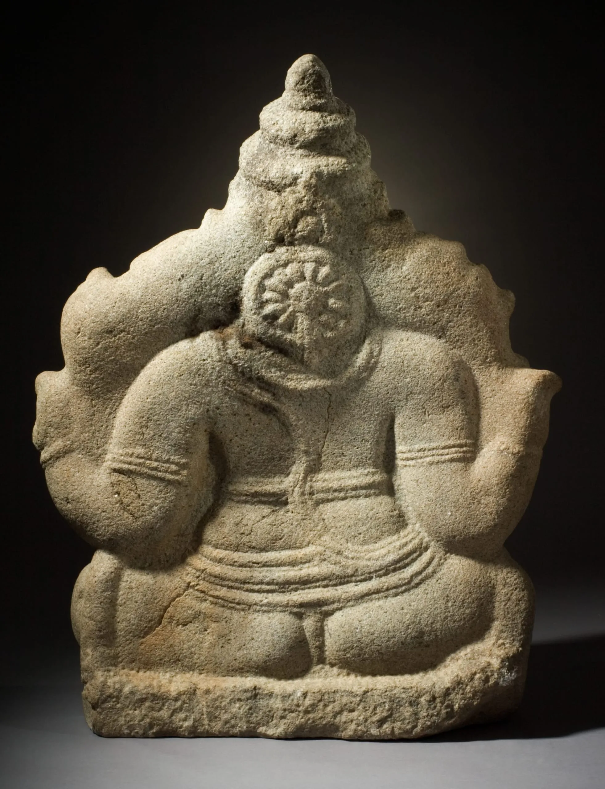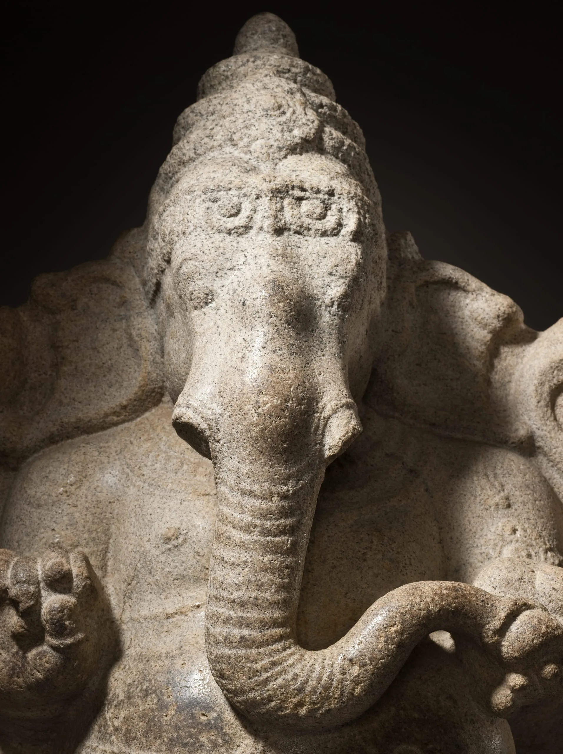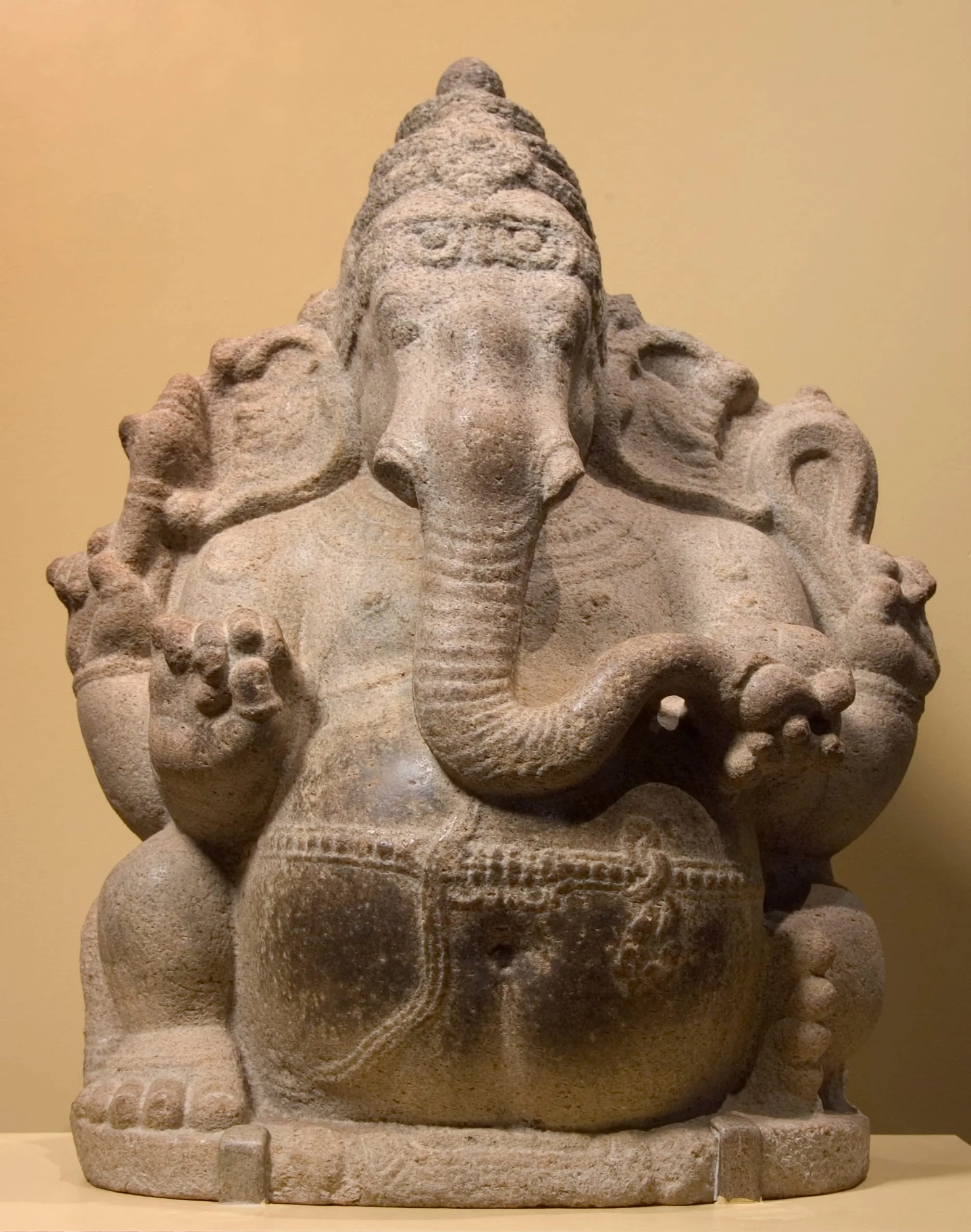 Ganesha holds a battle axe in his upper right hand, his broken tusk in his lower right, a noose in his upper left hand, and a sweetmeat in his lower left that he is about to pick up with his trunk. The sculpture has a dark patina on his belly from being rubbed for good fortune. The backside of Ganesha’s body is fully articulated and has a pronounced swayback.