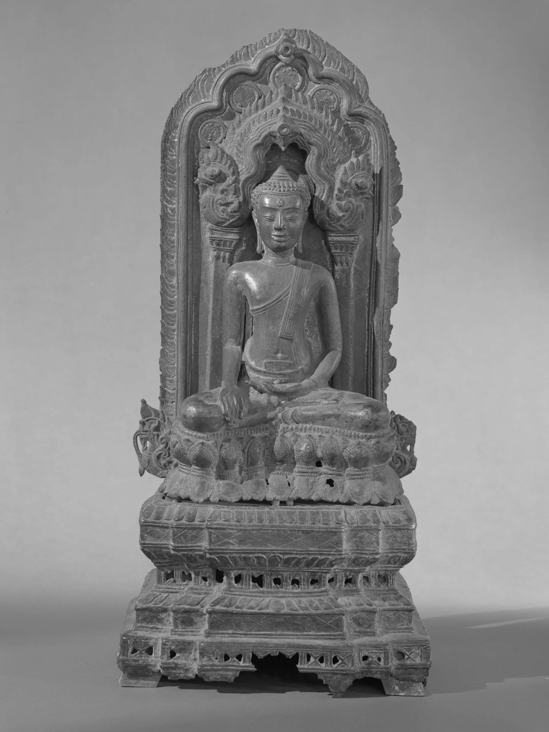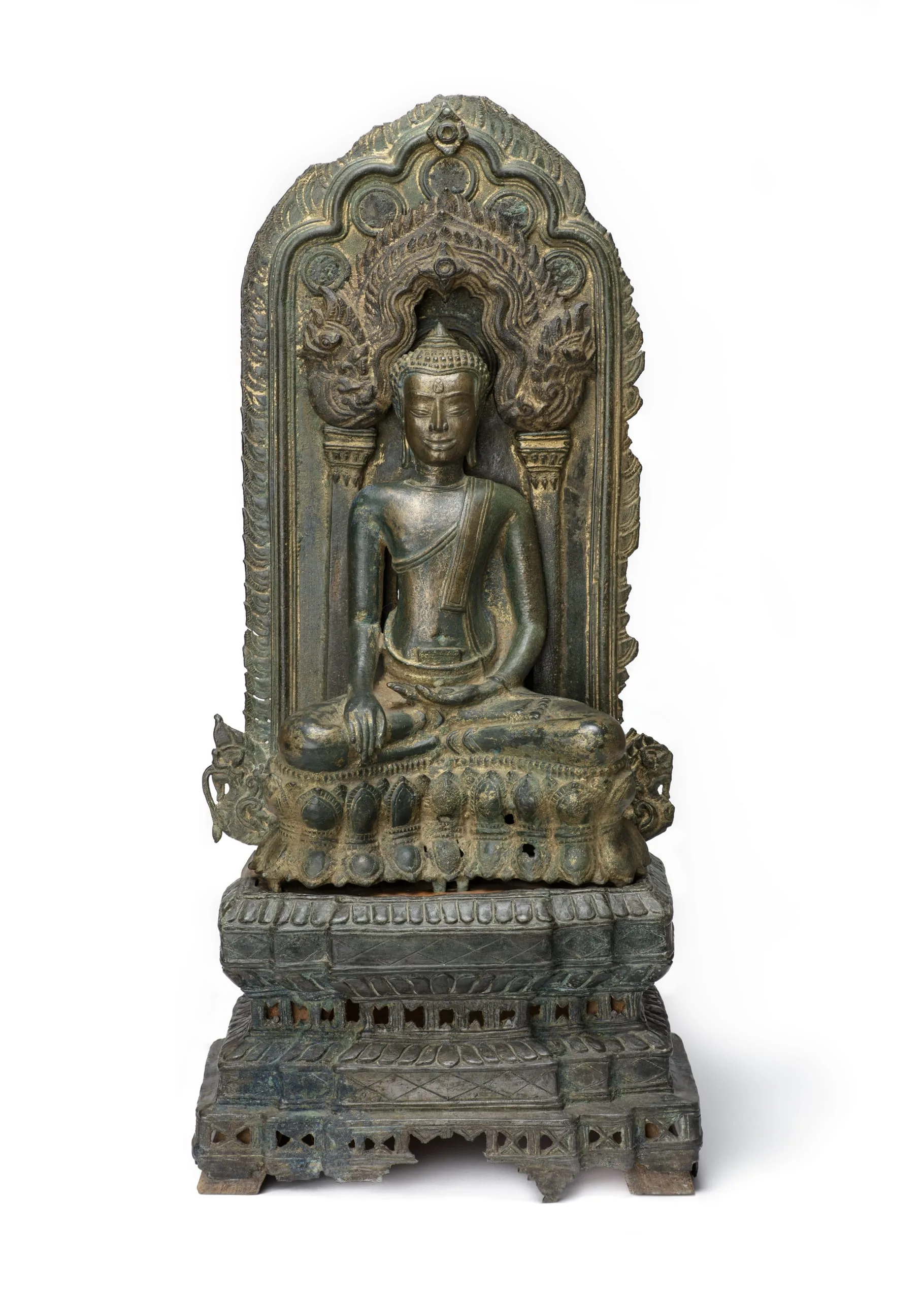 The historical Buddha Shakyamuni, traditionally dated to 563–483 BCE, is depicted in this 13th-century bronze image made in the artistic style associated with Lopburi, the Cambodian (Khmer) provincial capital during the 11th-13th centuries located in present-day central Thailand.