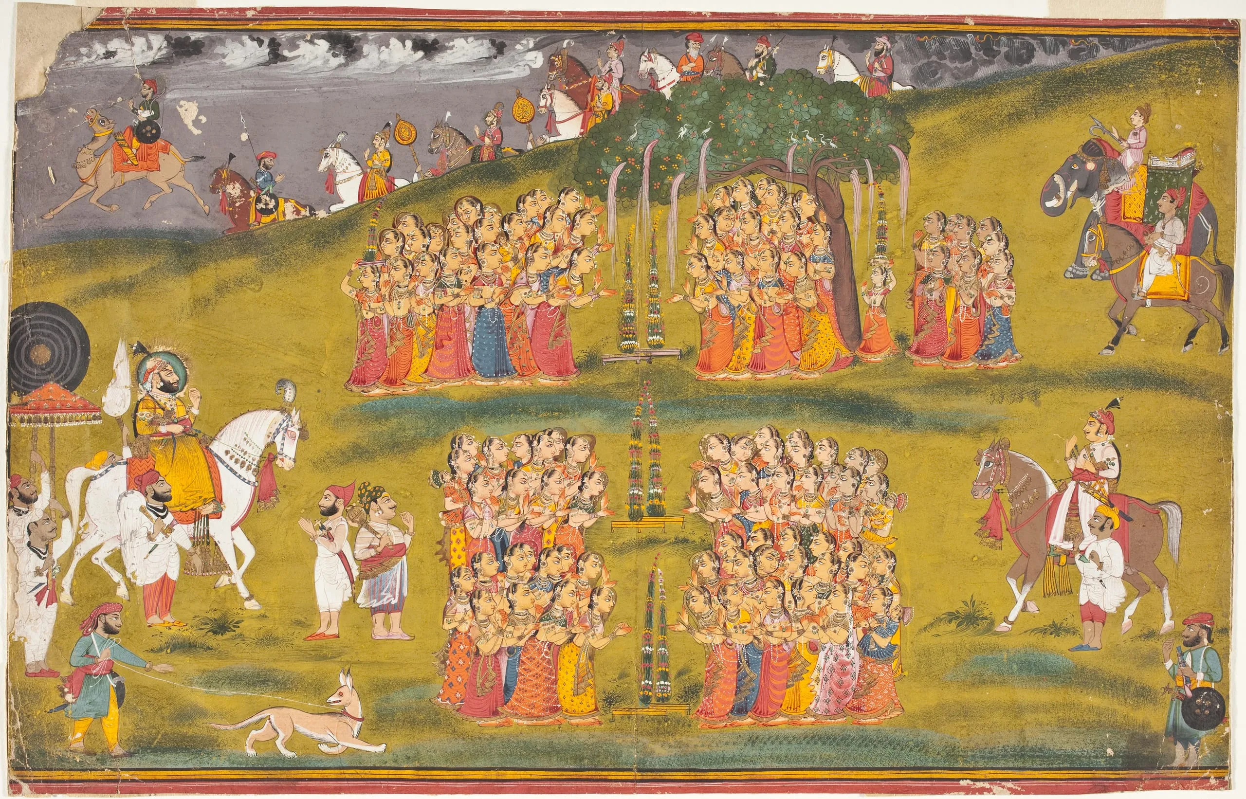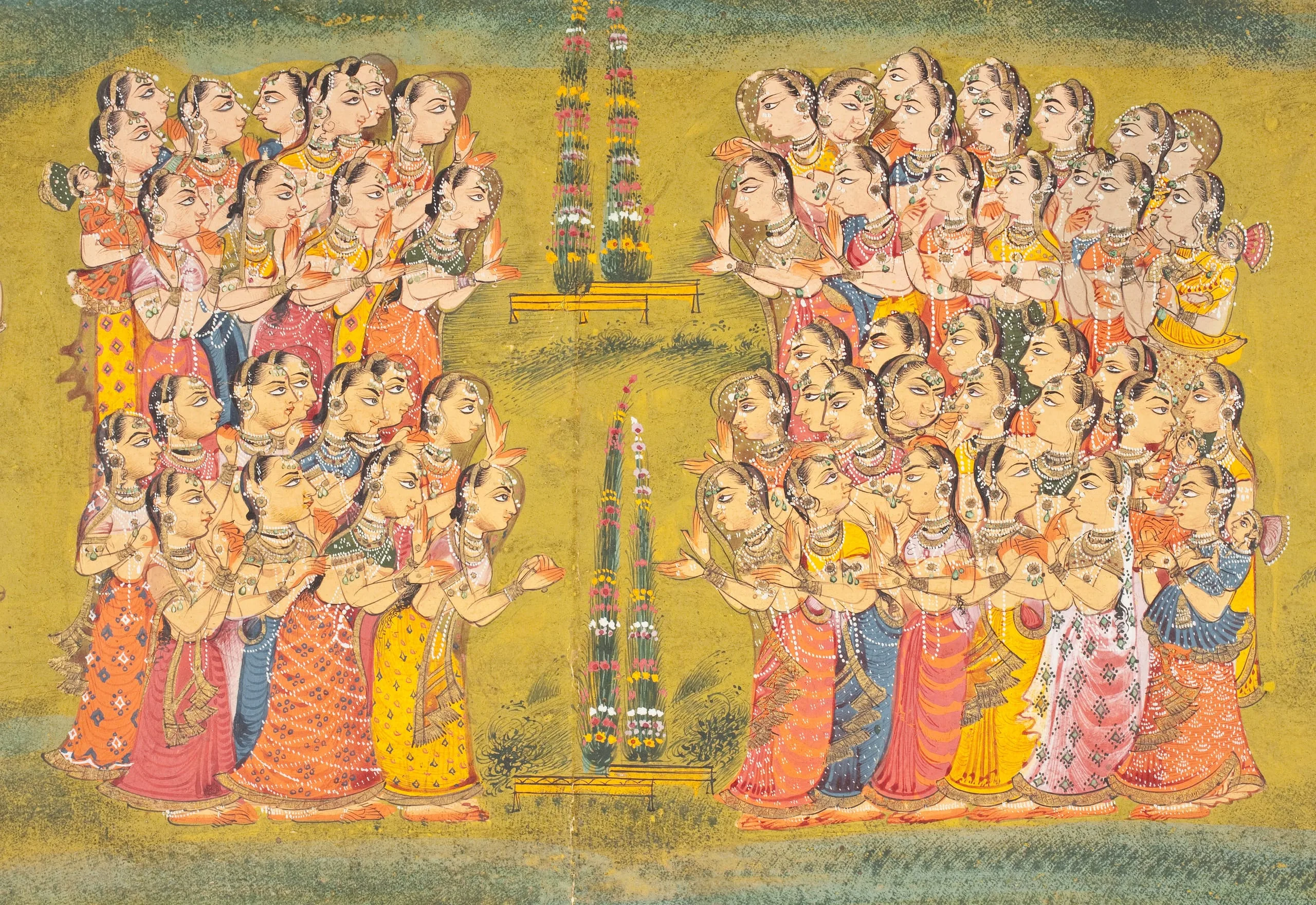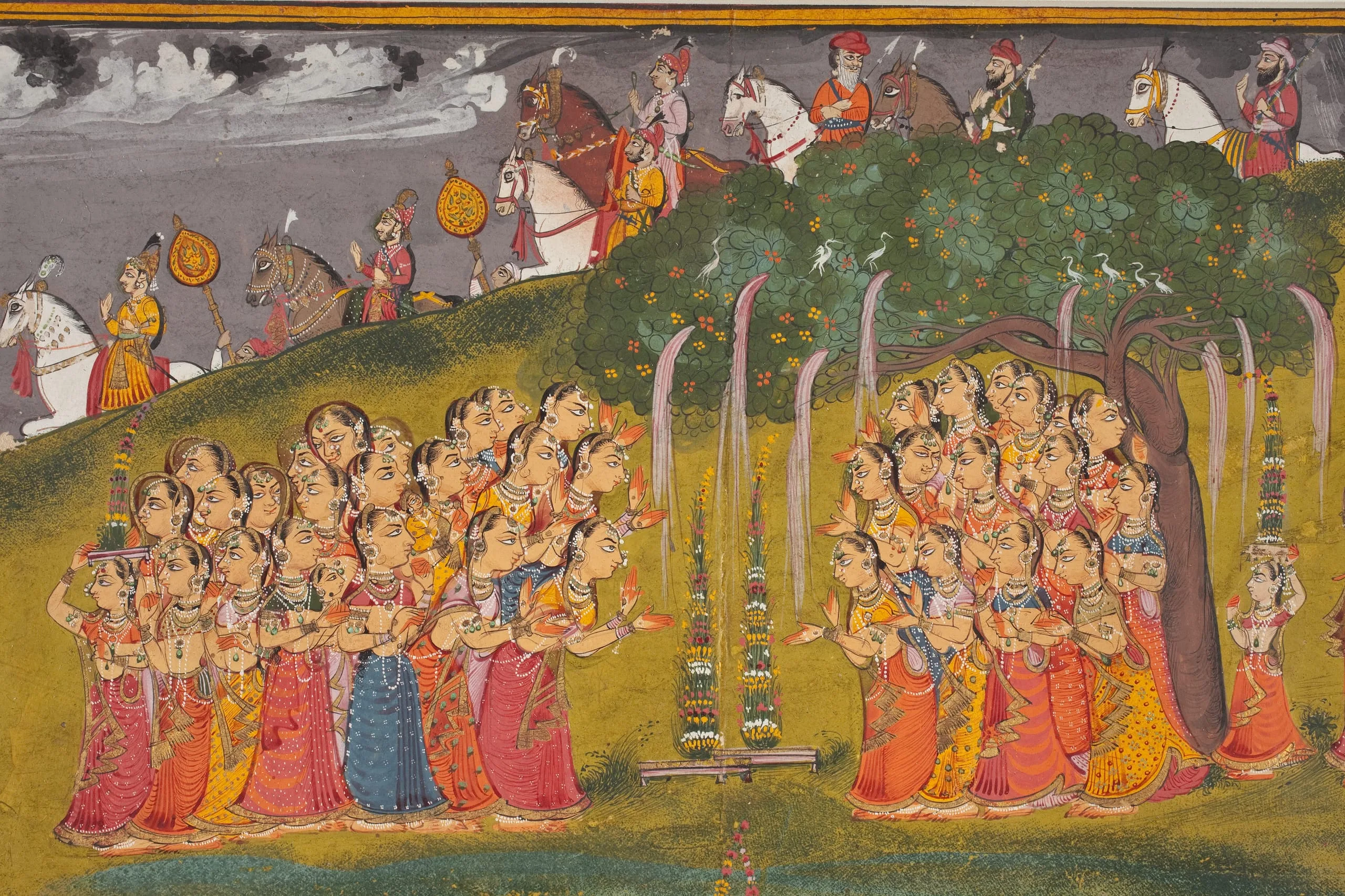 In this painting, the nimbate Bhim Singh arrives on the left seated on a white horse to watch women perform the Teej festival below a stylized pipal tree. He is accompanied by a large retinue of attendants and nobles riding horses, a camel, and an elephant. Five groups of women, wearing mainly red or yellow garments according to custom, perform the ceremony by offering tall floral bouquets on stands to honor the marriage of Shiva and Parvati and to pray for their blessings. Ominous cumulus clouds and thunderstorms in the purple-grey sky announce the arrival of the monsoon season. See also M.81.280.6.