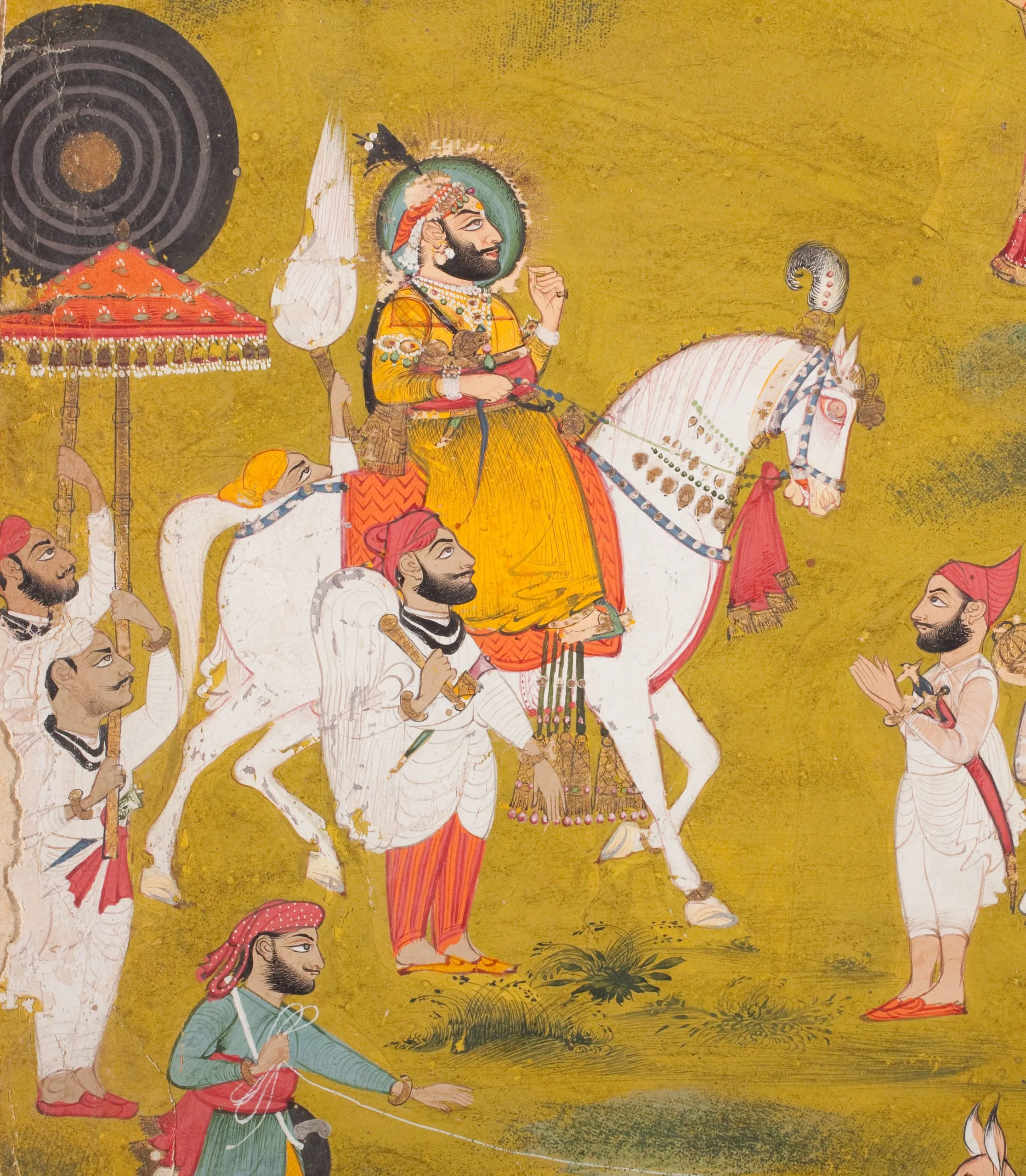Maharana Bhim Singh of Udaipur (r. 1778-1828) was born in 1768, ascended the throne at age ten in 1778 under the regency of his mother Sadar Kanwar, and died in 1828. He was the 26th Maharana of Mewar (r. 1778-1818) and, after politically aligning Mewar with the English East India Company in 1818, the 1st Maharana of the Princely state of Udaipur (r. 1818-1828). Early in his reign Bhim Singh primarily commissioned portraits of himself hunting and in royal processions, but by circa 1800 his portraits were predominantly in palace settings attended by court women and servants.