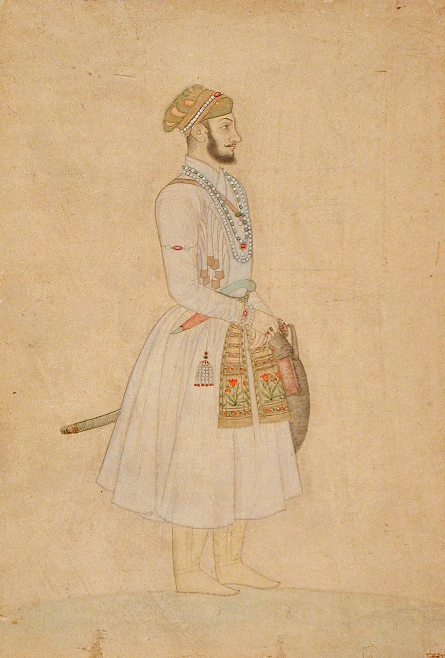 In this nim qalam (half-pen) lightly tinted drawing, Bahadur Shah I stands in three-quarter view with his head facing left in full profile. On his head is a flat green-and-orange turban embellished with a string of pearls with a ruby centerpiece. Around his neck he wears a long strand of pearls and a shorter strand of pearls and emeralds with a ruby and pearl pendant. He wears a pearl and ruby armlet and matching bracelet and a pearl bracelet. He wears a white coat (jama), with pleats dangling where the coat is tied under his right arm, and a brocaded waist sash. He has a dagger (khanjar) with a light green jade pistol-grip shaped hilt and a pendant bejeweled tassel. A sword and shield are suspended on his far side.