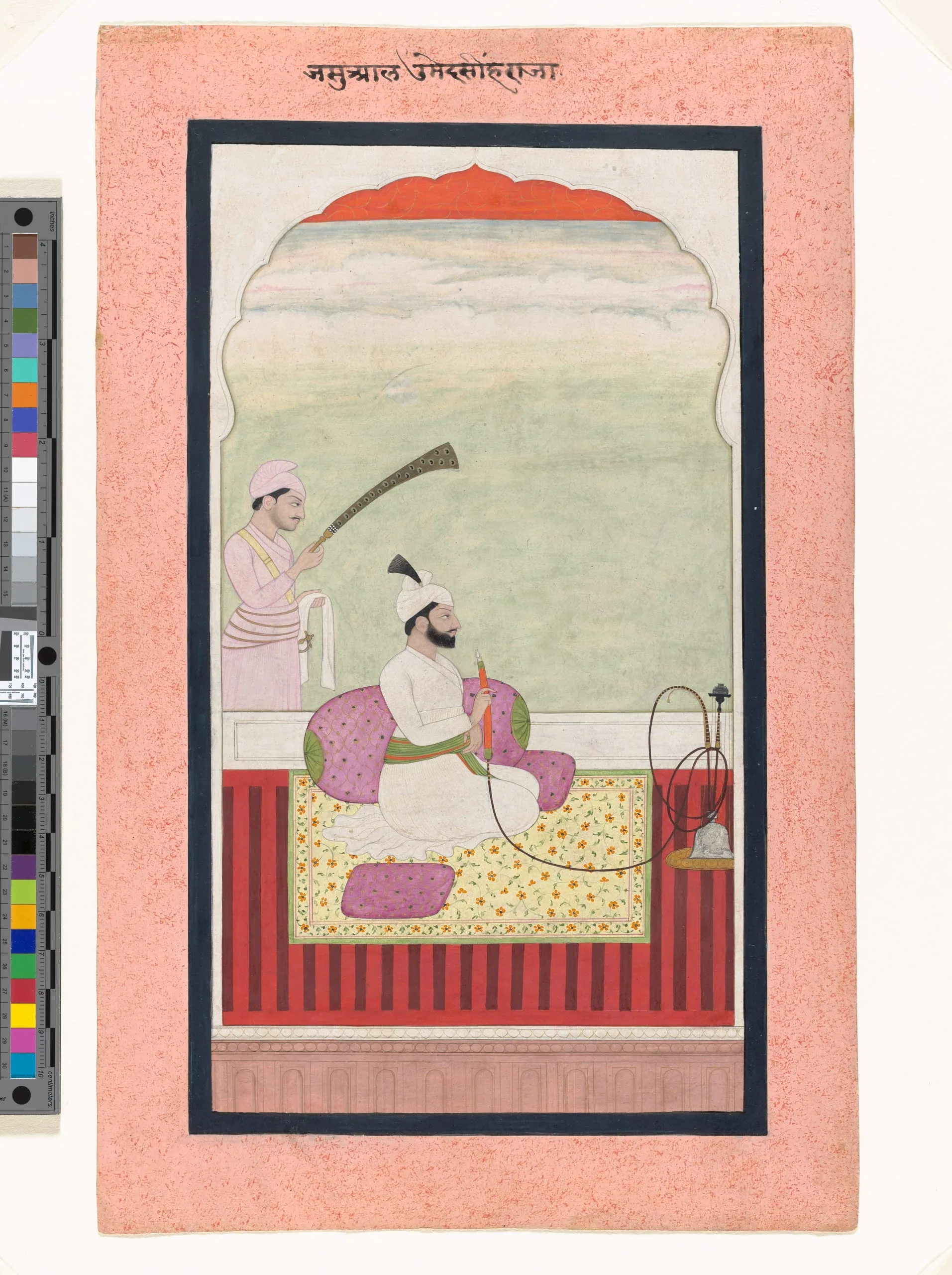 In this painting, Umed Singh is seated on a floral carpet leaning against a bolster on a palace terrace behind a cusped archway. He has a feather plume in his white turban, which matches his white coat (jama). His only jewelry is a gold pinky ring. He is smoking a flat-bottomed hookah, which is his sole royal accoutrement. An attendant waves an honorific peacock feather fly whisk (morchal) over his head.
