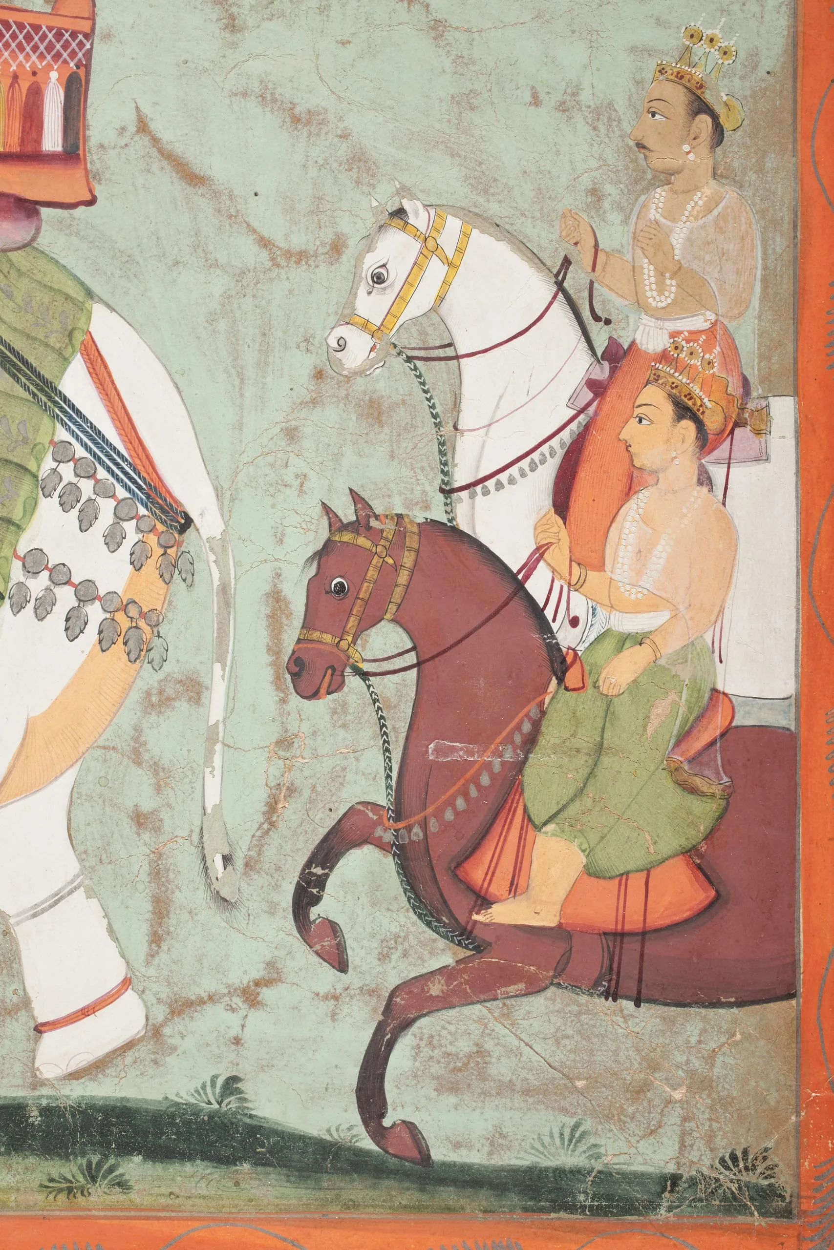 This folio [#7] depicts Indra and Indrani riding in a howdah on Indra’s mount, the multi-trunked white elephant Airavata, in a procession going to Marudevi’s palace to collect Rishabhanatha. Another folio in the series, now in the Pierpont Morgan Library, depicts a procession going in the opposite direction when Indra returned from the palace conveying the infant Jina under an honorific parasol. A partially effaced identifying title is written in gold above the divine couple.