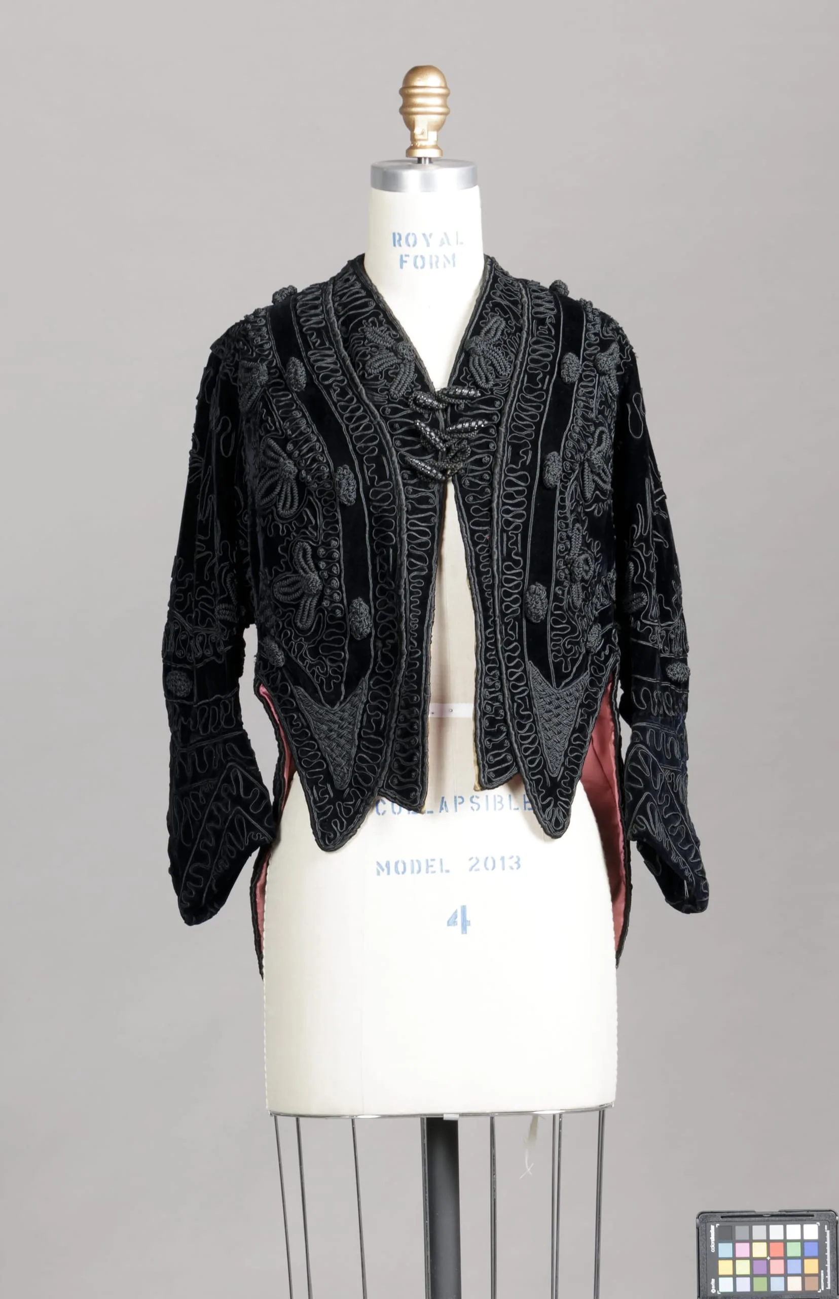 Short black velvet jacket on a dressmaker's form, densely covered in raised black cord passementerie trim forming scrolling and floral patterns, with scalloped pointed hem tabs