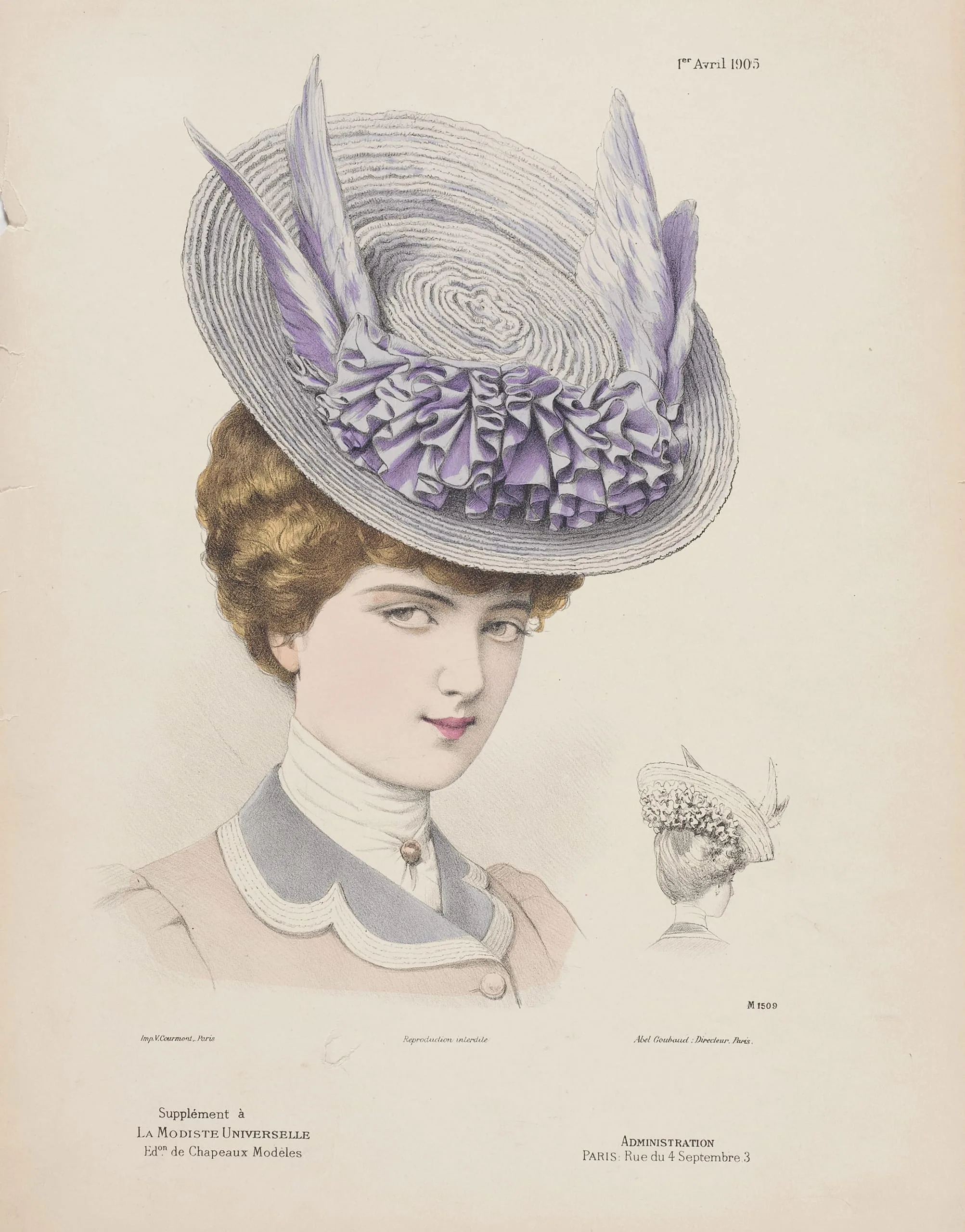 Hand-colored fashion print from 1905 showing a woman in three-quarter profile wearing a wide straw hat trimmed with lavender ruffled ribbon and feathers, with a small rear-view sketch inset at lower right