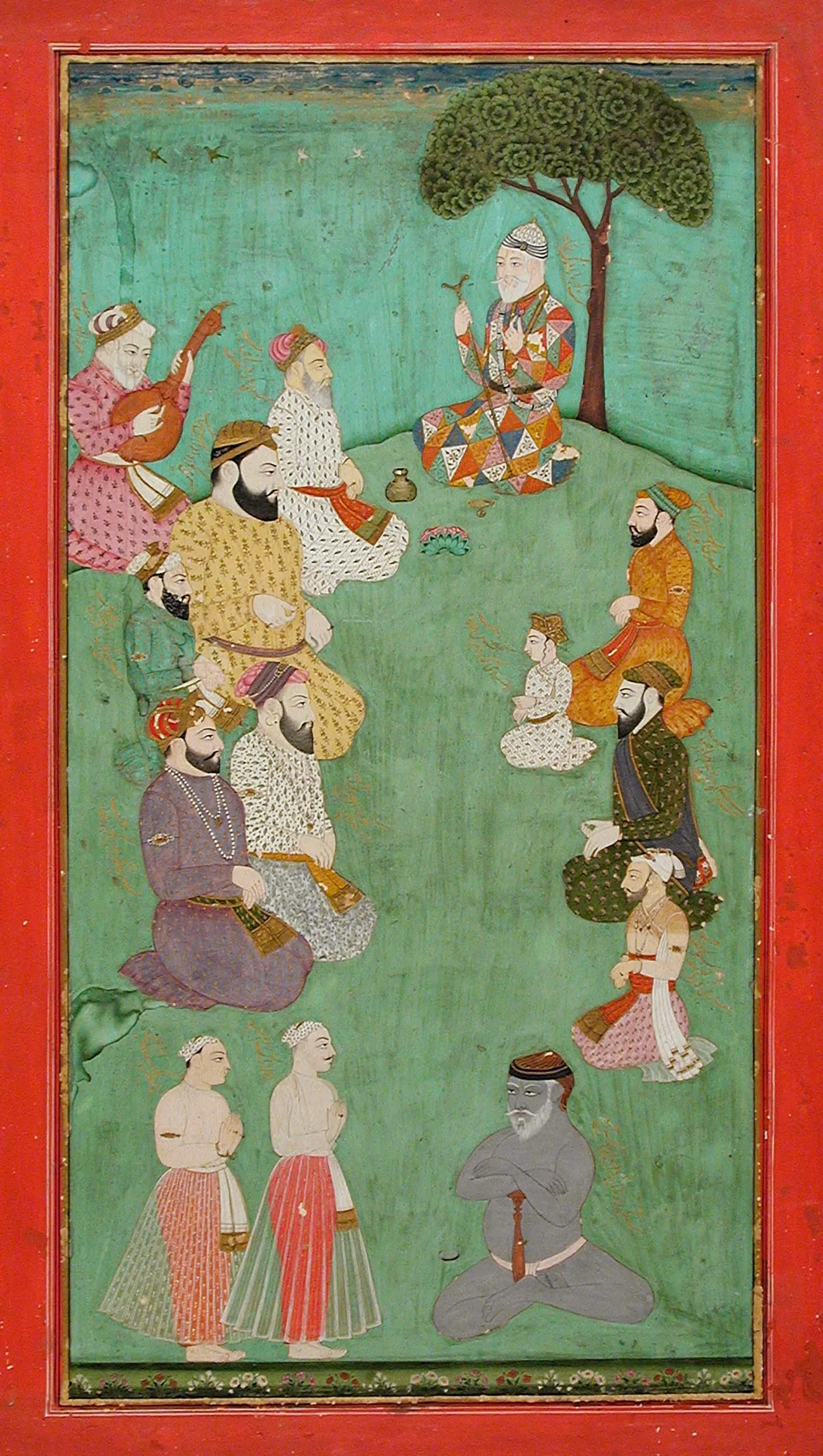 This painting depicts the ten Gurus of Sikhism, each of whom is identified by an inscription in gold. Guru Nanak (1469-1539), the founder of Sikhism and the first Sikh Guru, is seated under the regal tree. He wears a mukat (cap shaped crown) and a jacket of patchwork quilt. He holds an ascetic’s crutch and a flower (?). Mardana (1459-1534), Guru Nanak’s longtime Muslim disciple and companion, is playing a rubab (lute-like instrument). The nine other Sikh Gurus are seated in two columns. They are identified from top-to-bottom as follows: left column: Angad (1504-1552), Amar Das (1479-1574), Ram Das (1534-1581), Arjan (1563-1606), and Hargobind (1595-1644); right column: Har Rai (1630-1661), Har Krishan (1656-1664), Tegh Bahadur (1621-1675), and Gobind Singh (1666-1708). At the bottom Lala Nanak Ram and his son Rai Lakhpat Ram stand reverentially before the Udasi saint, Satguru Pritam Das Chandra (1752-1831). Numerous painted and printed group images of the ten Sikh Gurus and the Janam Sakhi (Life Stories of Guru Nanak) series were produced in the 18th and 19th centuries, particularly in the Panjab and Kashmir. The ten Gurus are represented here in conventionalized portraits, mainly without the accompanying attributes some often have in later 19th-century renditions. The painting is rendered in a descendant Mughal-style featuring a plain green background with a narrow band of sky at the top and a floral border along the bottom.