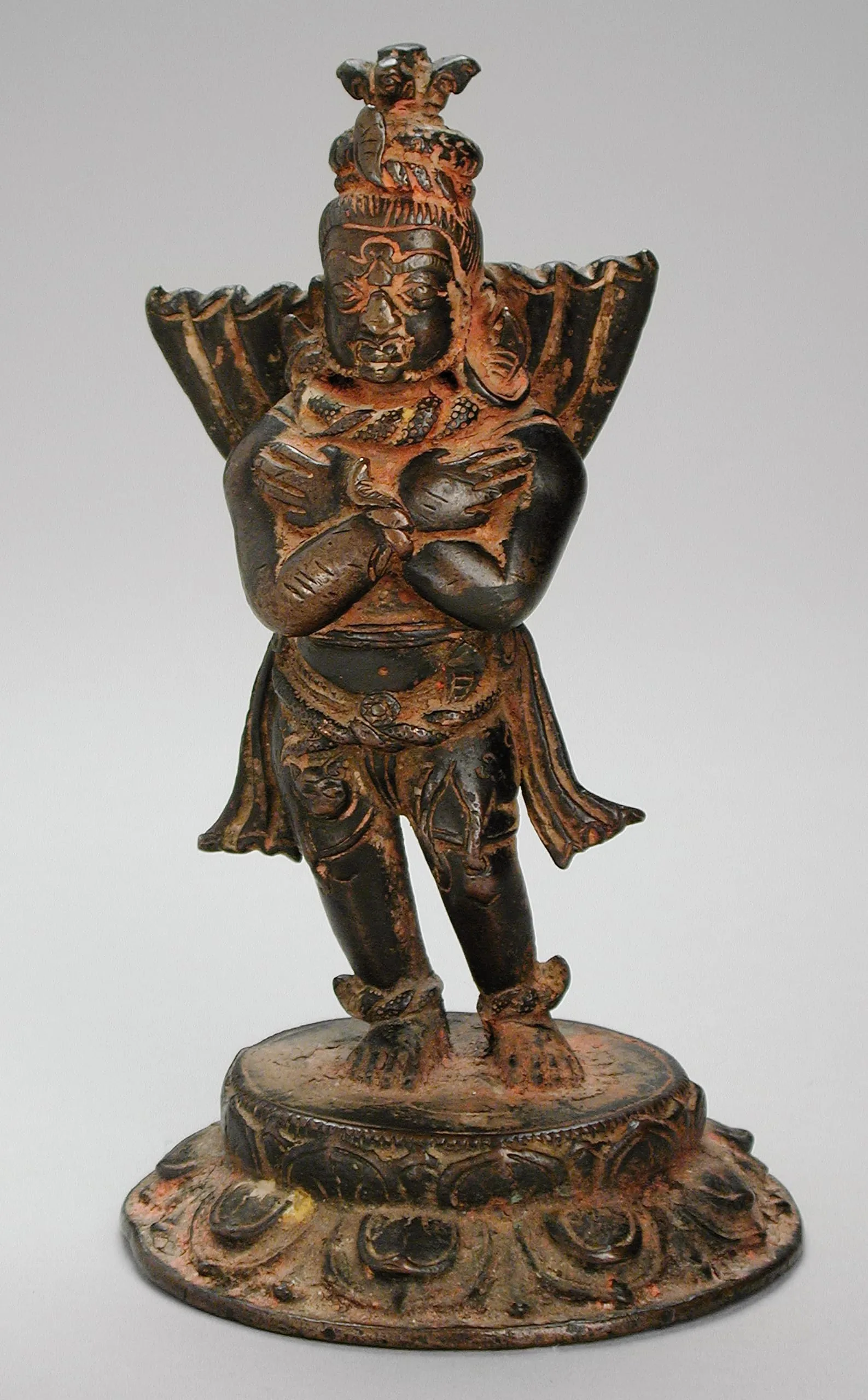 This representation of a Vajra Purusha follows the Nepalese convention of standing on a lotus base with a fierce expression and his arms crossed against his chest in a gesture of subservience (vinaya hasta). The prongs of the thunderbolt protrude from his hair bun. He wears a serpent as a necklace and another as a belt. He also has a leopard skin draped around his waist. His short cape billows behind him.