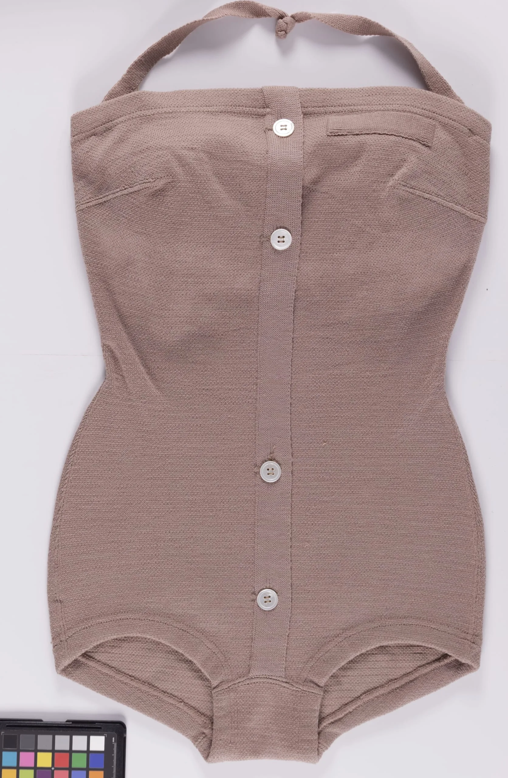 - Swimsuit: Wool and elastic knit with mother of pearl buttons; Belt: Plastic