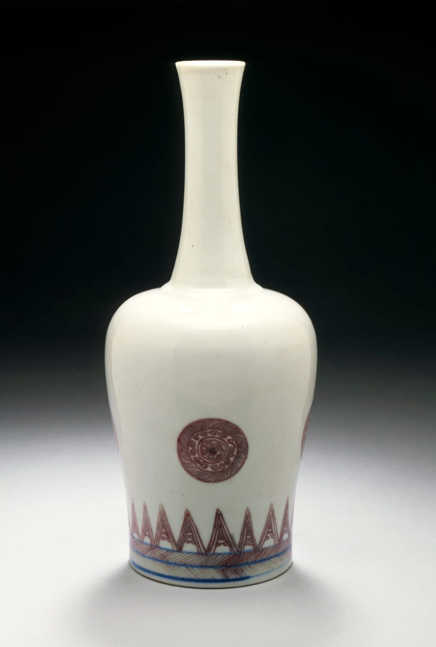- Wheel-thrown porcelain with red painted decoration under clear glaze