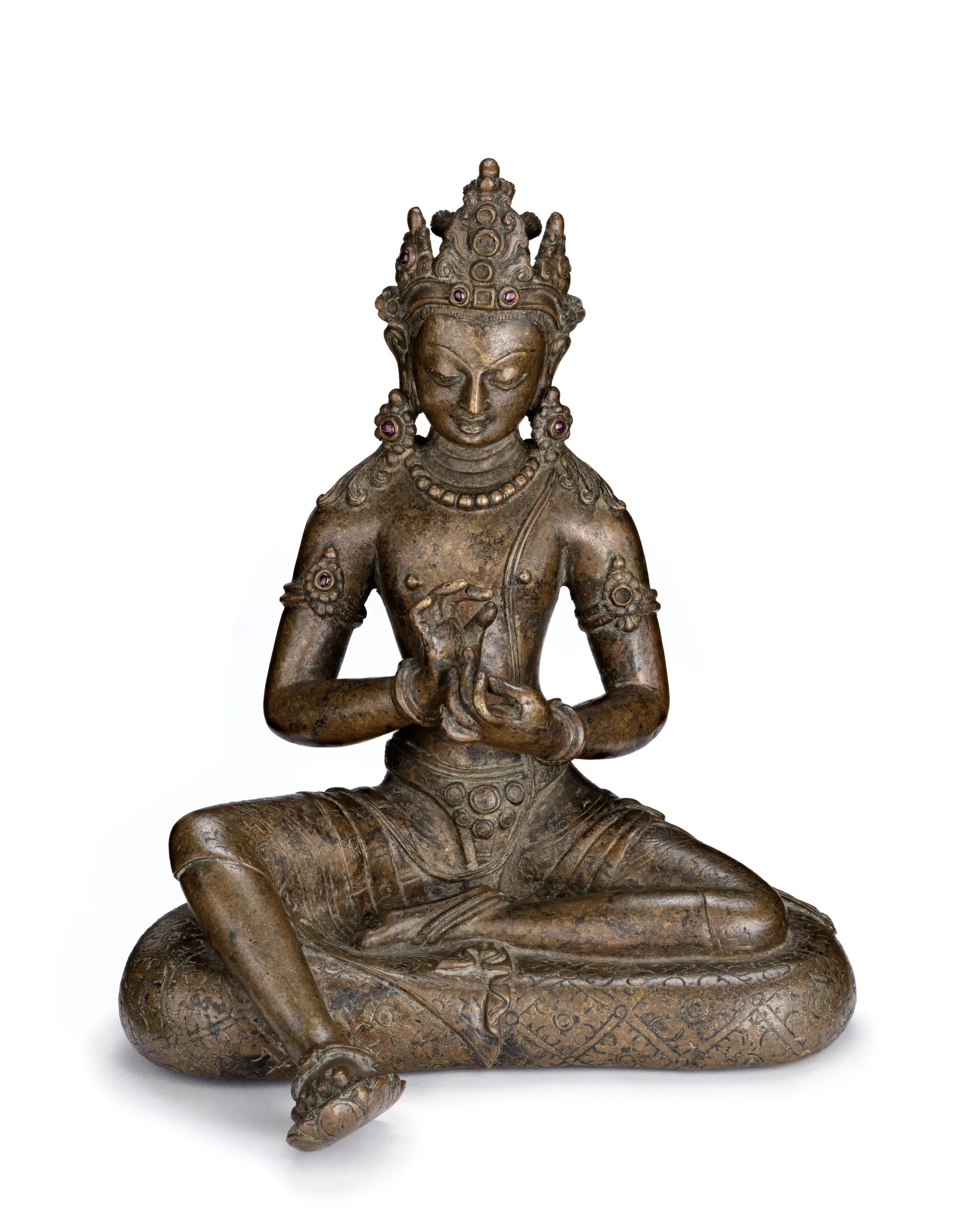 Manjushri is envisioned in at least fourteen iconographic forms per religious textual sources. He is often shown brandishing his sword of wisdom and holding a manuscript of the Prajnaparamita (Perfection of Wisdom) surmounted on a lotus stalk (M.78.136 and M.75.4.6). Or he sometimes carries only the sacred manuscript (M.75.4.9). Here, in a form known as Dharmachakra Manjushri, he holds his hands in the gesture of Turning the Wheel of the Law (dharmachakra mudra). He is crowned and has long locks of hair cascading onto his shoulders. He wears jewelry inlaid with rubies and the Brahmanical sacred thread (yajnopavita) worn over his left shoulder. He sits on an ovoid patterned cushion in the relaxed posture (lalita asana) with his right leg pendant and supported by the pericarp of a lotus flower (karnika).