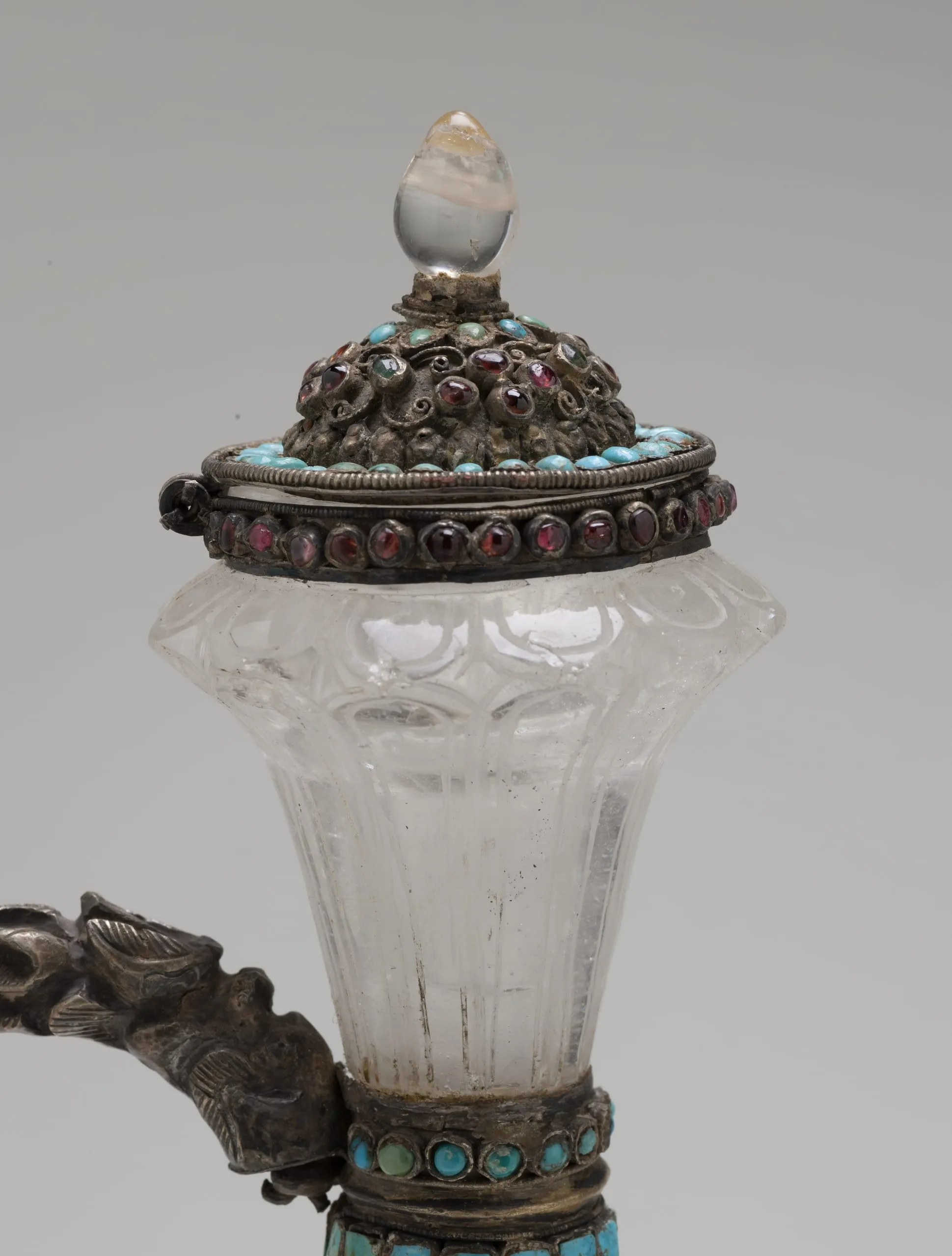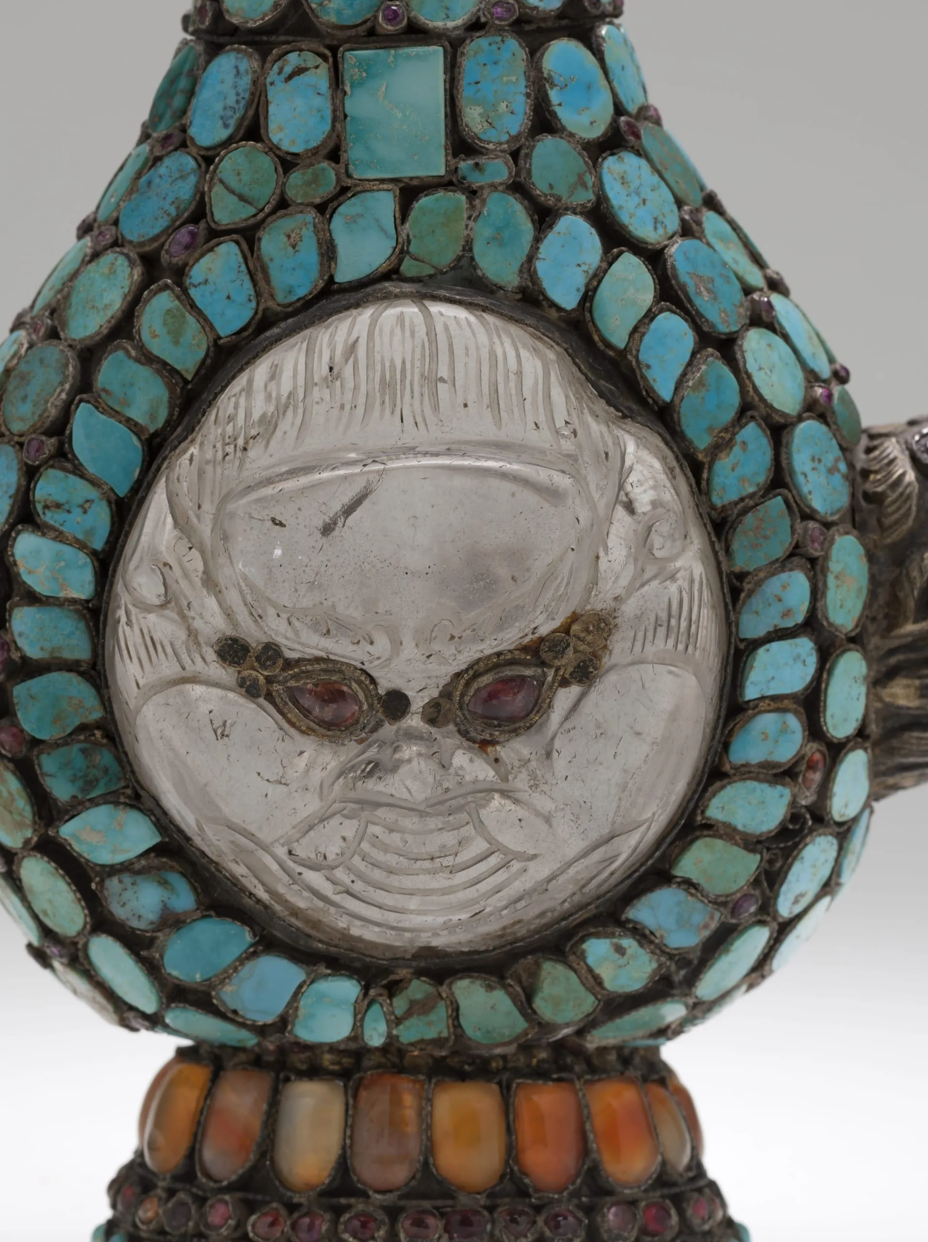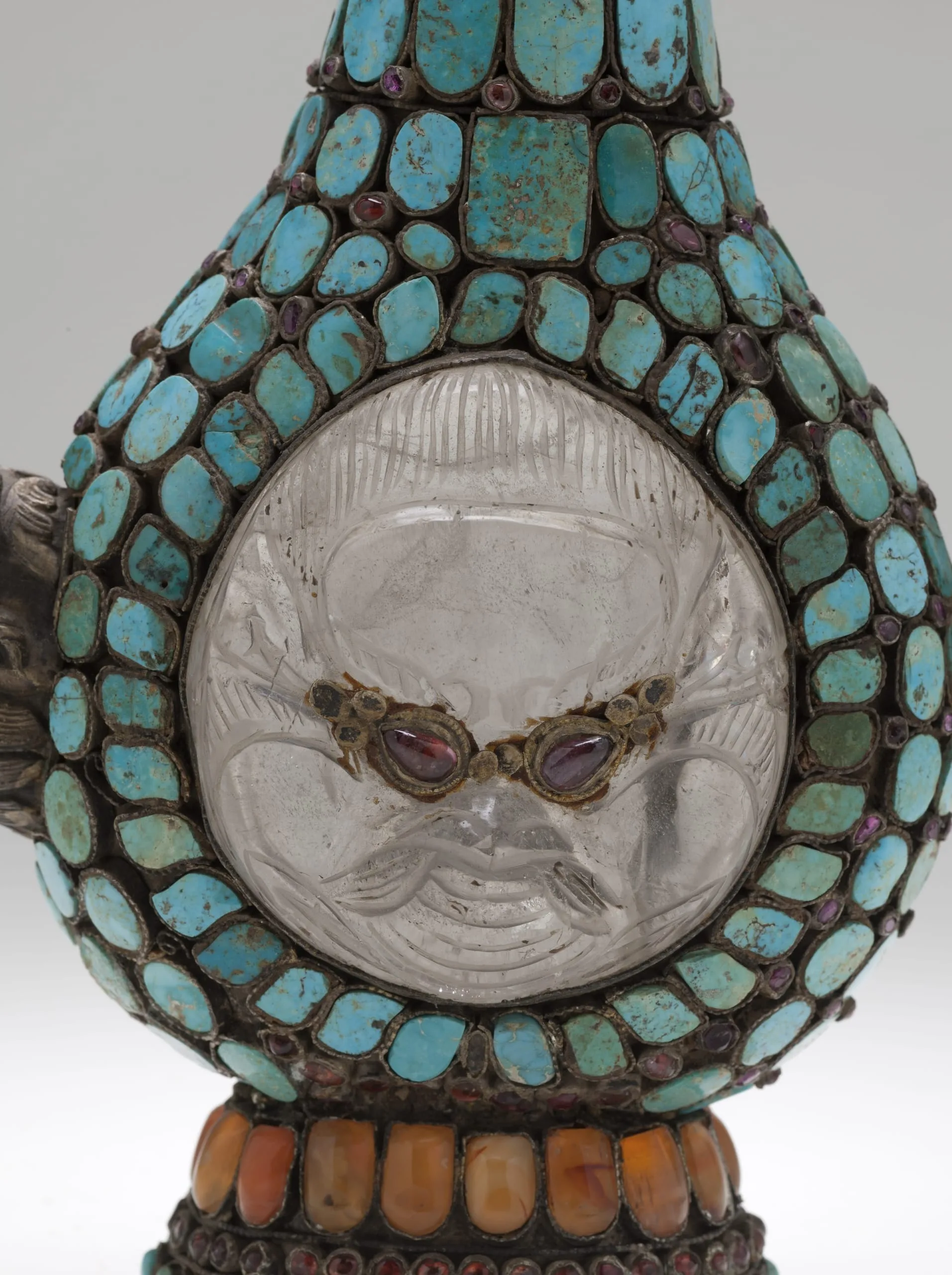 This morphological form of this Tibetan ewer derives from that of a Central Asian, Islamic, or Indo-Islamic water vessel (aftaba), such as AC1995.52.1 and M.83.2.2. Its silver filigree and gem-encrusted inlay indicate it was made by a Newari artist in Tibet or working for the Tibetan trade. The ewer has a bulbous body inset with turquoise that is supported by a pedestal foot inset with opals and turquoise. The principal decorative motif on the body is a rock crystal mask of a mythical animal, the zipac, which is a Tibetan apotropaic symbol resembling the Indian "Face of Glory" (kirttimukha) and the Chinese gluttonous creature (taotie). The neck is a fluted and hollowed piece of rock crystal that flares at the top into lotus petals. The lid is encrusted with inset gemstones and has a rock crystal knob finial in the form of a lotus bud. The vessel has a tall, slender silver spout issuing out of the mouth of a mythical aquatic creature (makara). It has a S-shaped silver handle terminating in a dragon’s head at the neck with an inlaid foliated tail attached to the body. See also M.84.227.2 and M.85.295.2a-b.