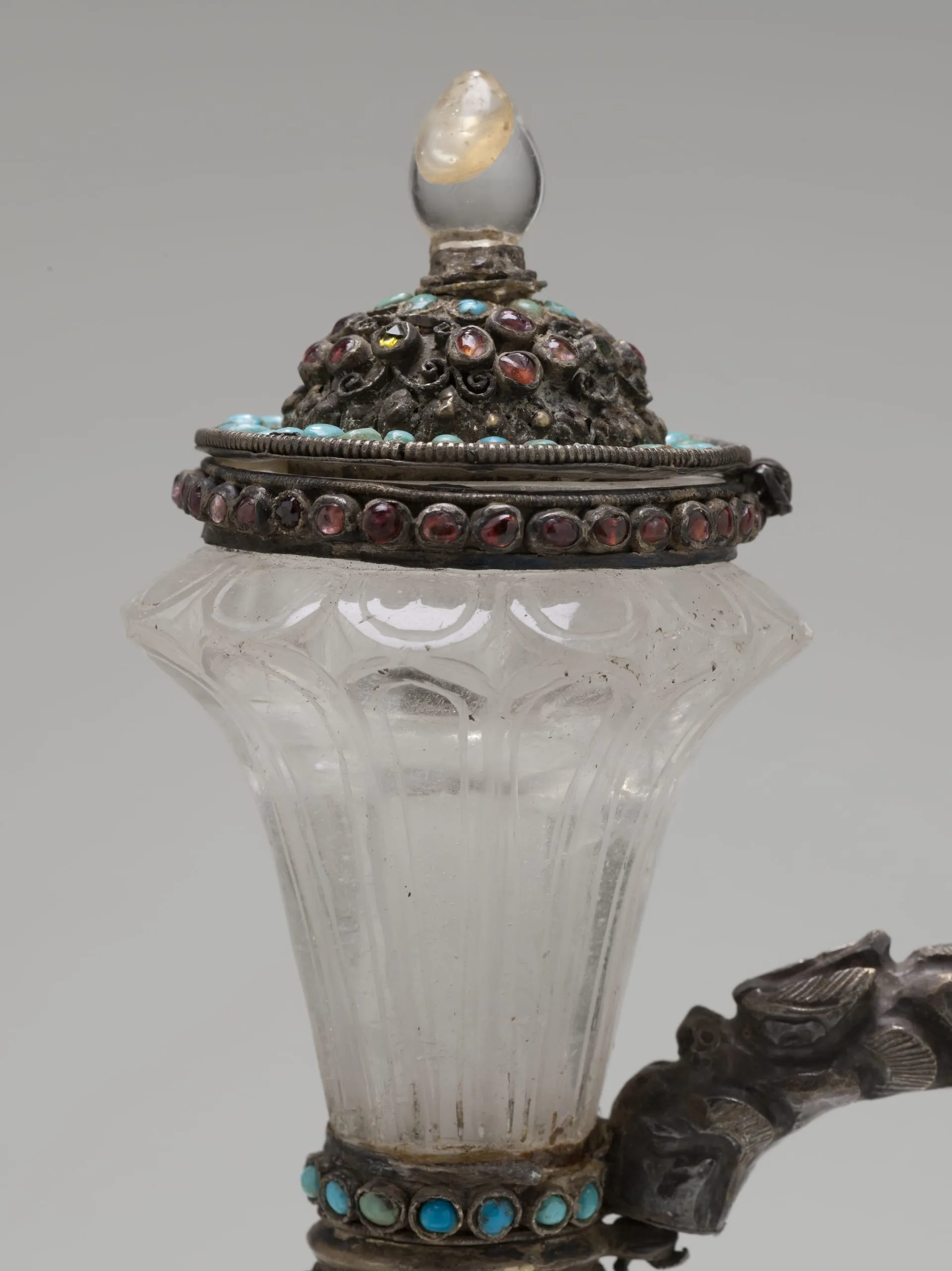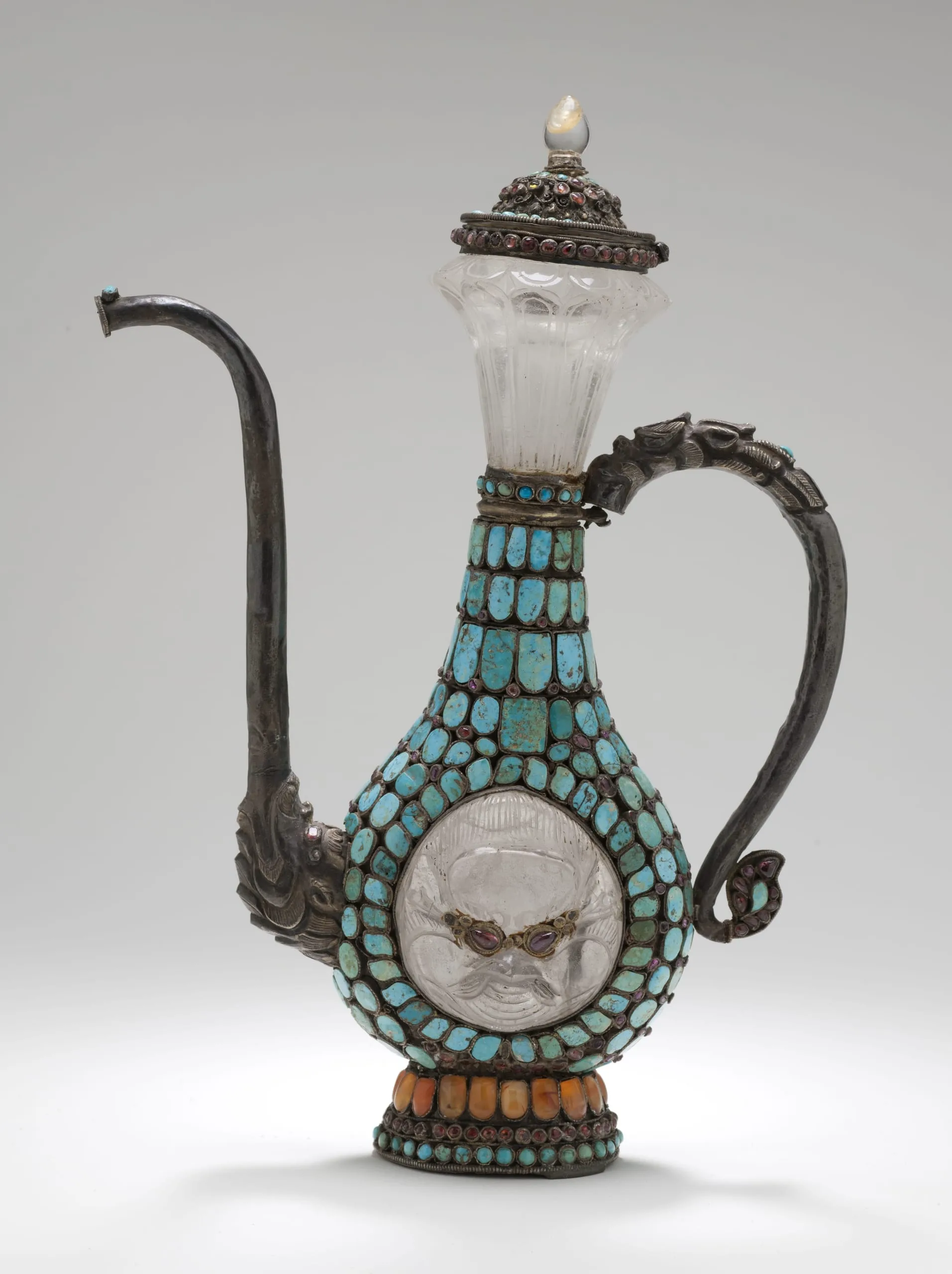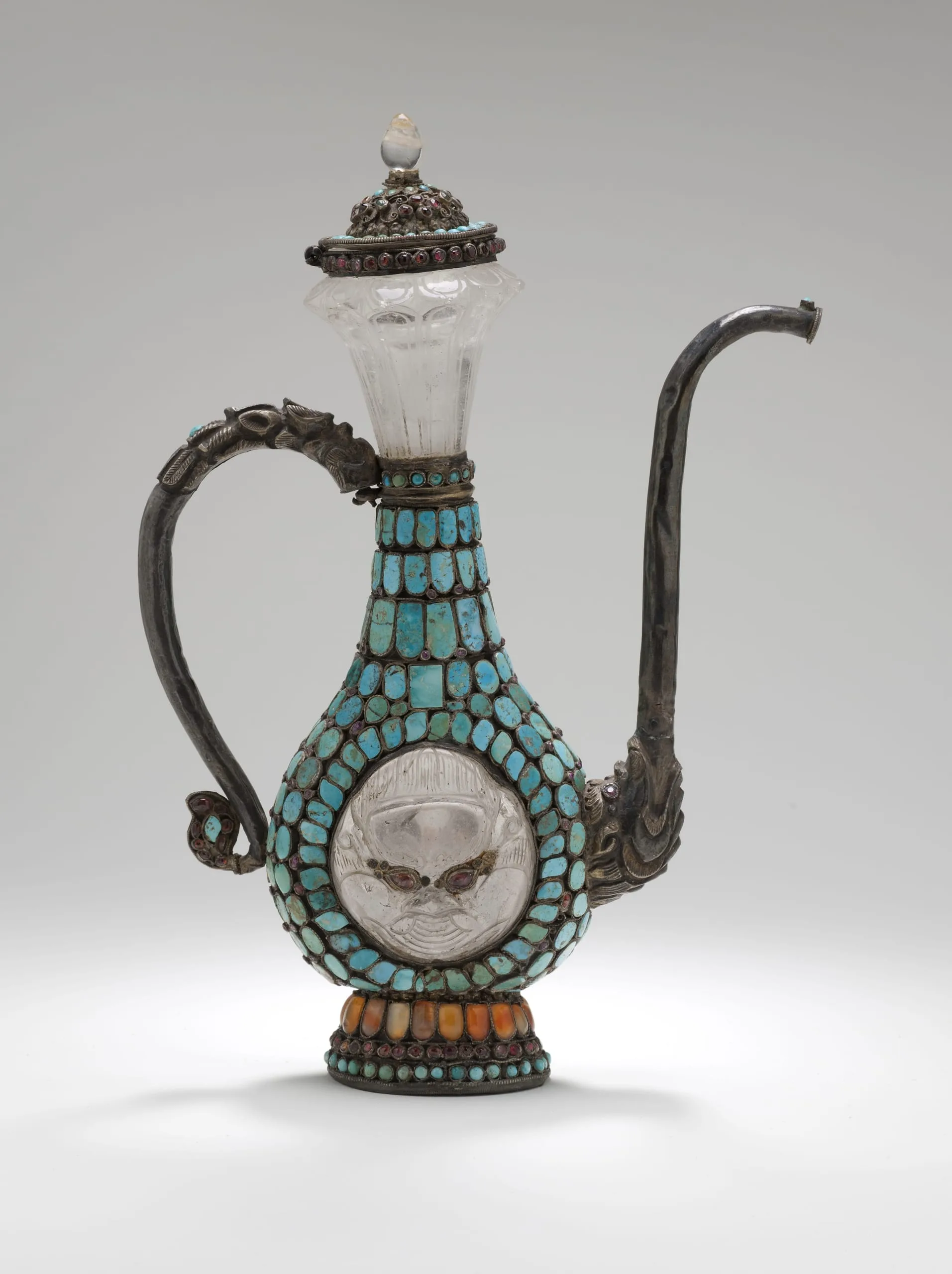 This morphological form of this Tibetan ewer derives from that of a Central Asian, Islamic, or Indo-Islamic water vessel (aftaba), such as AC1995.52.1 and M.83.2.2. Its silver filigree and gem-encrusted inlay indicate it was made by a Newari artist in Tibet or working for the Tibetan trade. The ewer has a bulbous body inset with turquoise that is supported by a pedestal foot inset with opals and turquoise. The principal decorative motif on the body is a rock crystal mask of a mythical animal, the zipac, which is a Tibetan apotropaic symbol resembling the Indian "Face of Glory" (kirttimukha) and the Chinese gluttonous creature (taotie). The neck is a fluted and hollowed piece of rock crystal that flares at the top into lotus petals. The lid is encrusted with inset gemstones and has a rock crystal knob finial in the form of a lotus bud. The vessel has a tall, slender silver spout issuing out of the mouth of a mythical aquatic creature (makara). It has a S-shaped silver handle terminating in a dragon’s head at the neck with an inlaid foliated tail attached to the body. See also M.84.227.2 and M.85.295.2a-b.