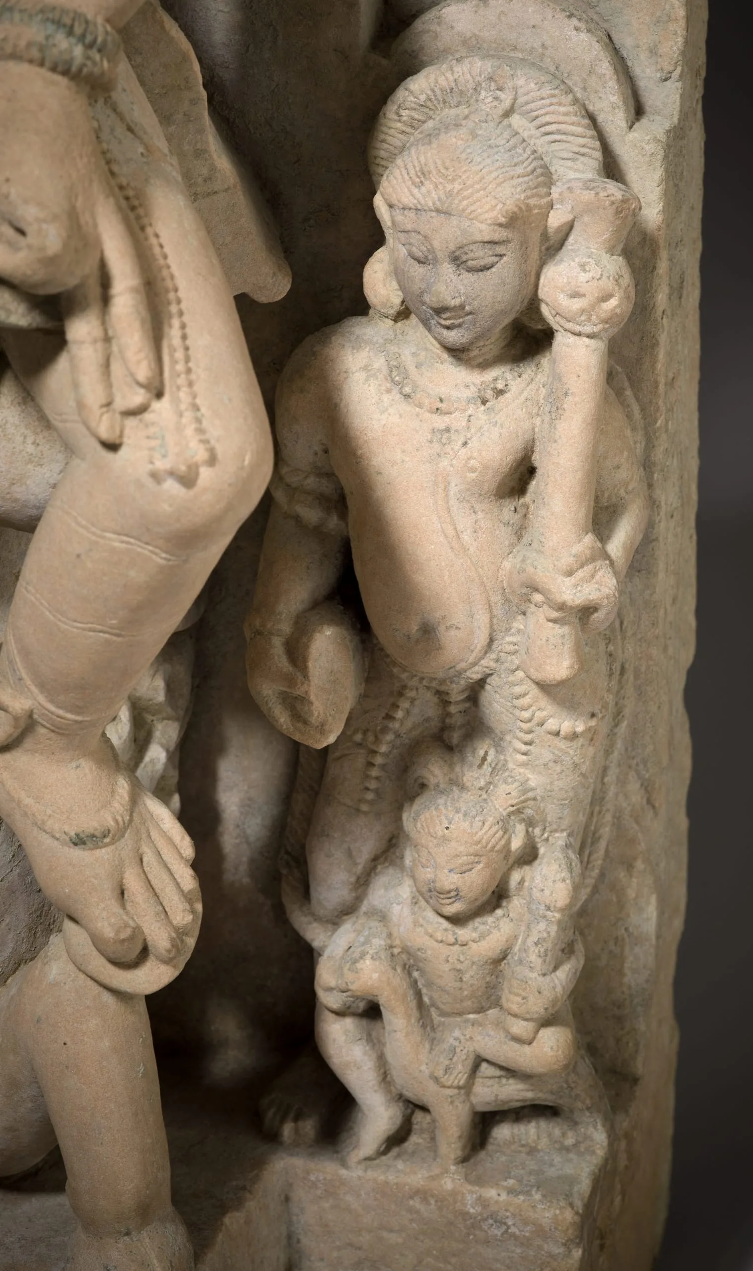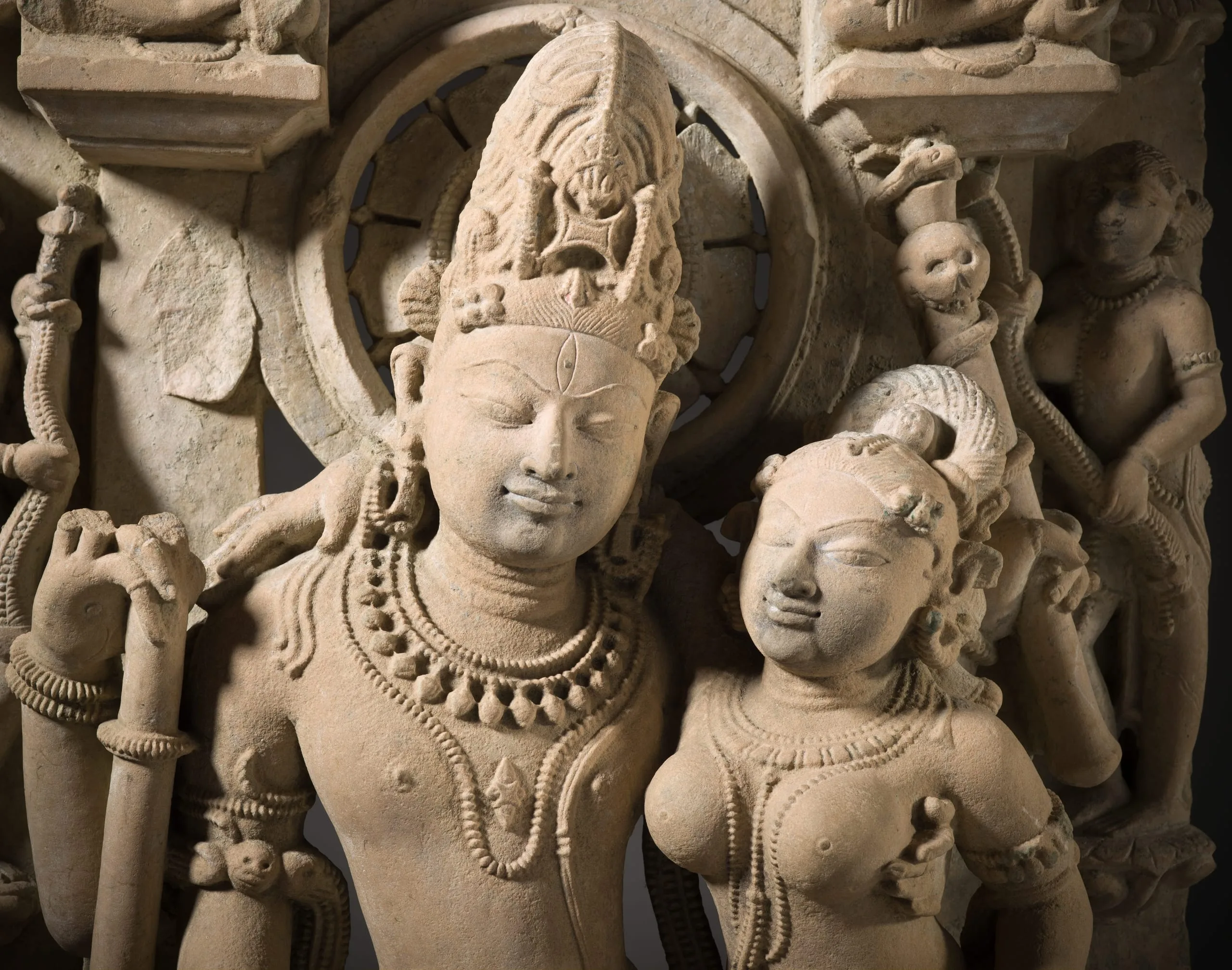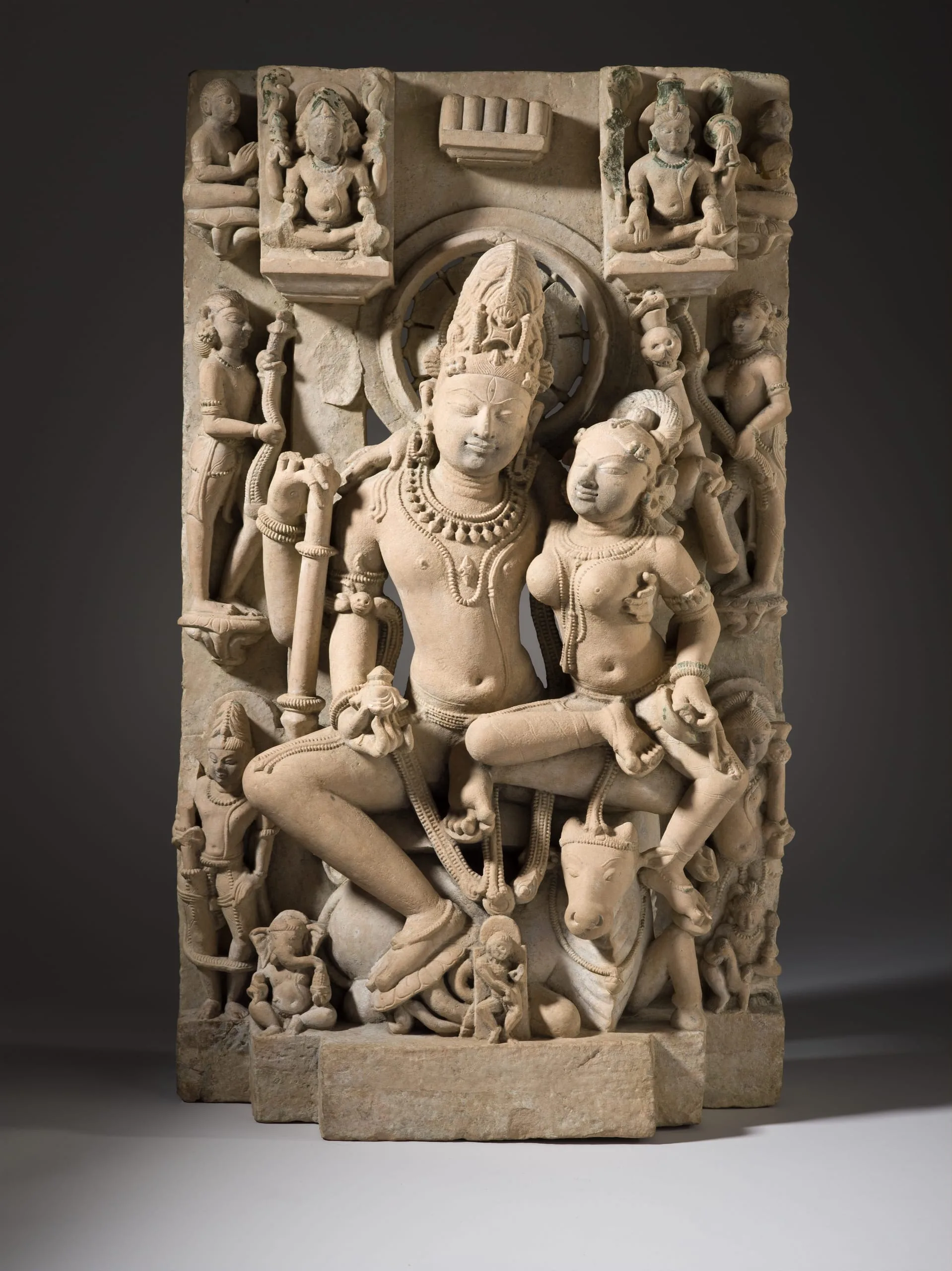 Shiva, the Hindu god of destruction, is seated with his wife, Parvati, a goddess of fertility, motherhood, and nurturance. Shiva is identified by the trident (now broken) in his right hand, the staff embellished with a snake and skull in his left, and his third eye of wisdom. His hair is piled atop his head in the matted locks of an ascetic and is adorned with his emblematic crescent moon. Parvati embraces her husband with her right arm and in her left hand holds a mirror that she uses to reflect her husband's glory as well as her own beauty. In this and other classic northern and central Indian images of Shiva and Parvati, the divine couple is typically portrayed interacting with a certain degree of restraint. This varies from eastern Indian images, in which their conjugal intimacy is more rapturously expressed.