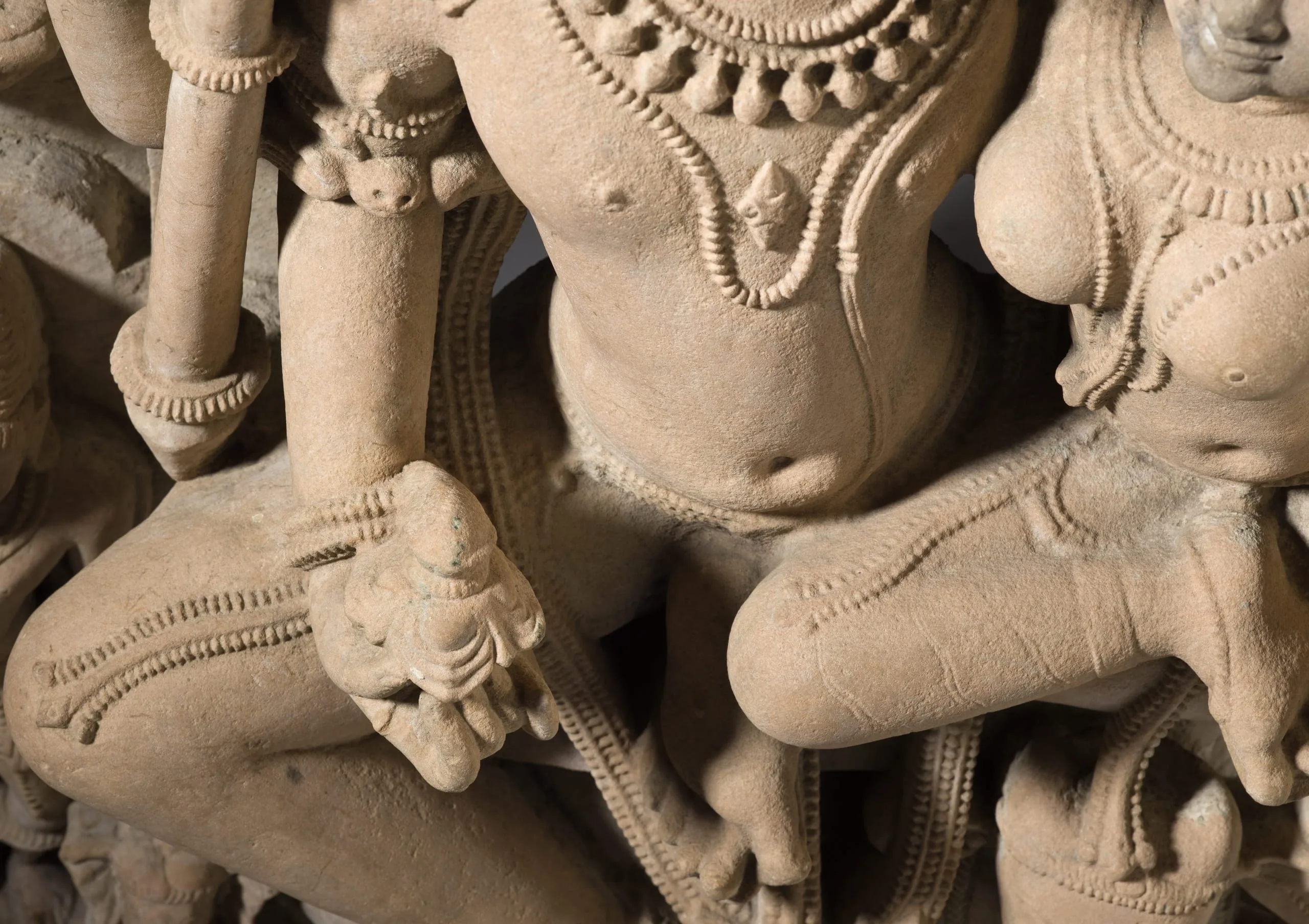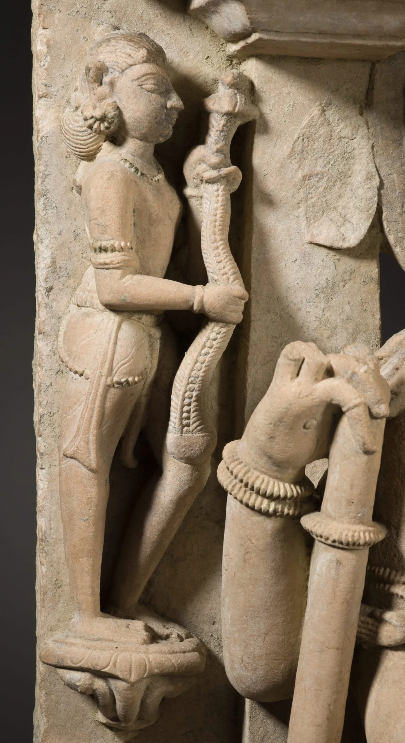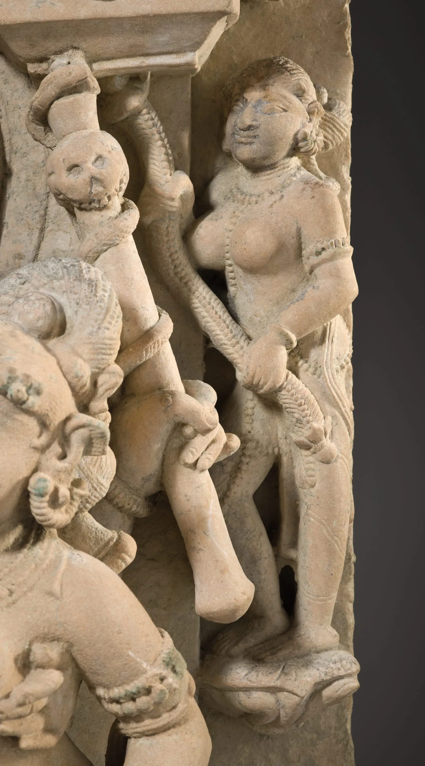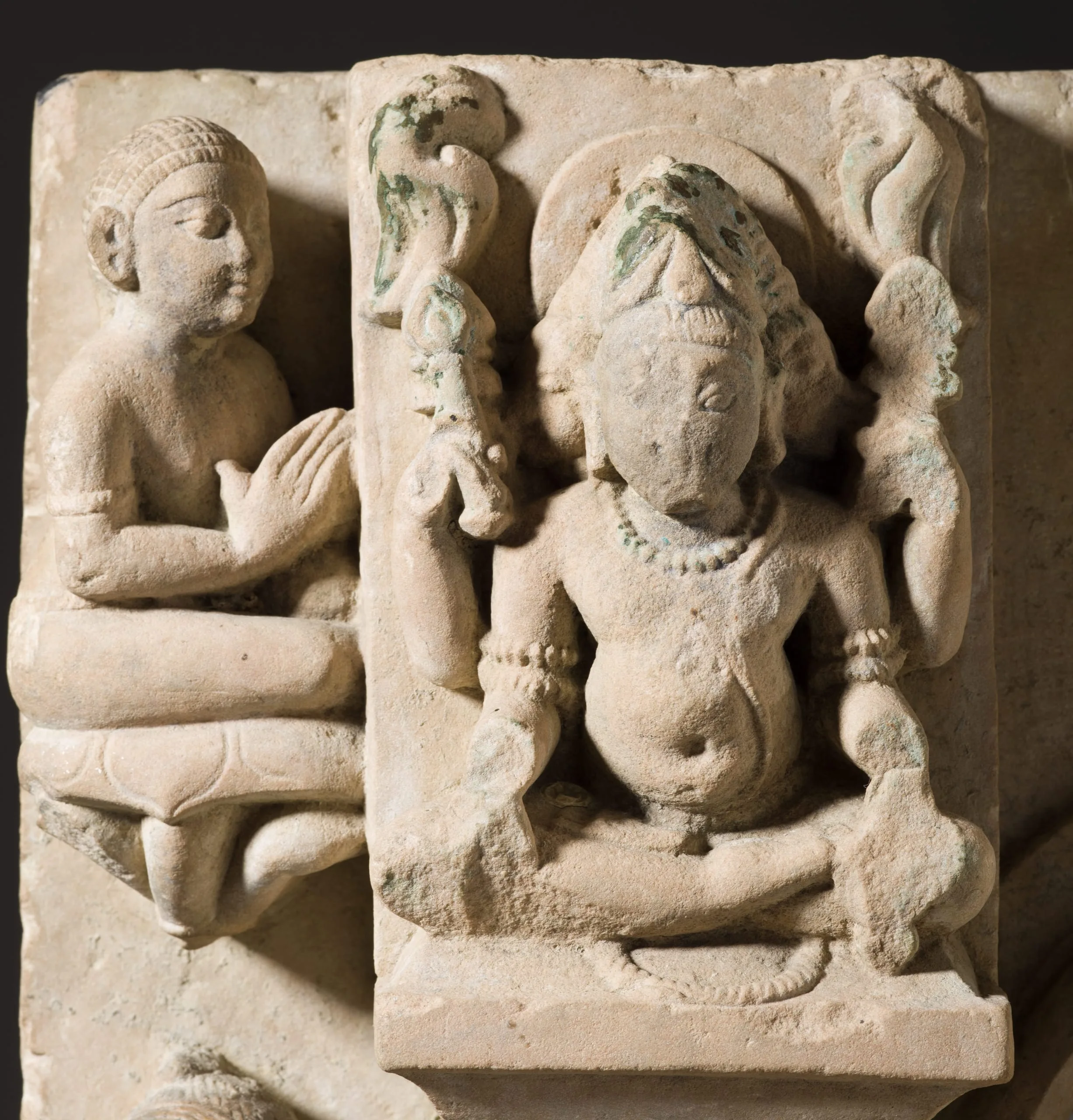 Shiva, the Hindu god of destruction, is seated with his wife, Parvati, a goddess of fertility, motherhood, and nurturance. Shiva is identified by the trident (now broken) in his right hand, the staff embellished with a snake and skull in his left, and his third eye of wisdom. His hair is piled atop his head in the matted locks of an ascetic and is adorned with his emblematic crescent moon. Parvati embraces her husband with her right arm and in her left hand holds a mirror that she uses to reflect her husband's glory as well as her own beauty. In this and other classic northern and central Indian images of Shiva and Parvati, the divine couple is typically portrayed interacting with a certain degree of restraint. This varies from eastern Indian images, in which their conjugal intimacy is more rapturously expressed.