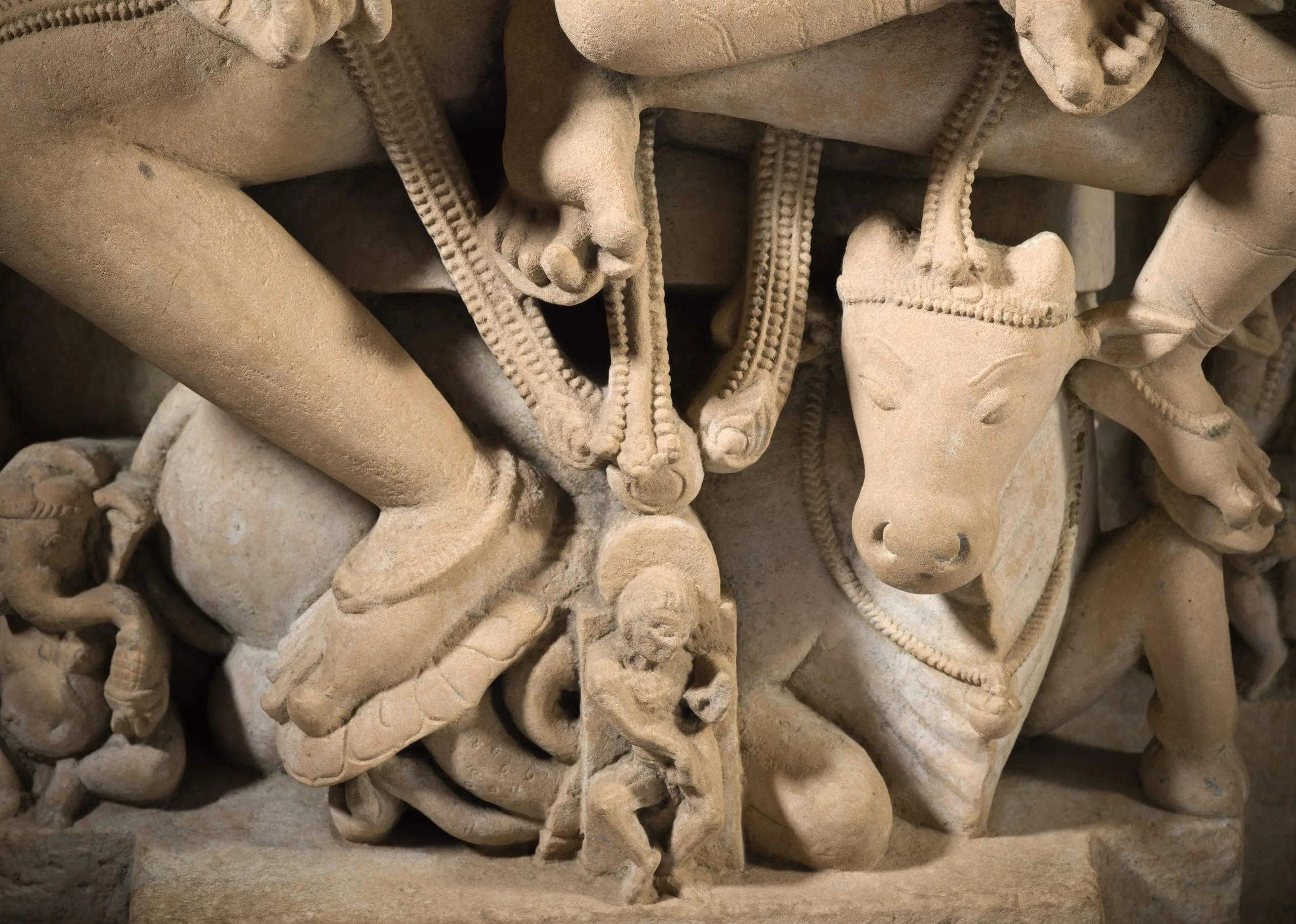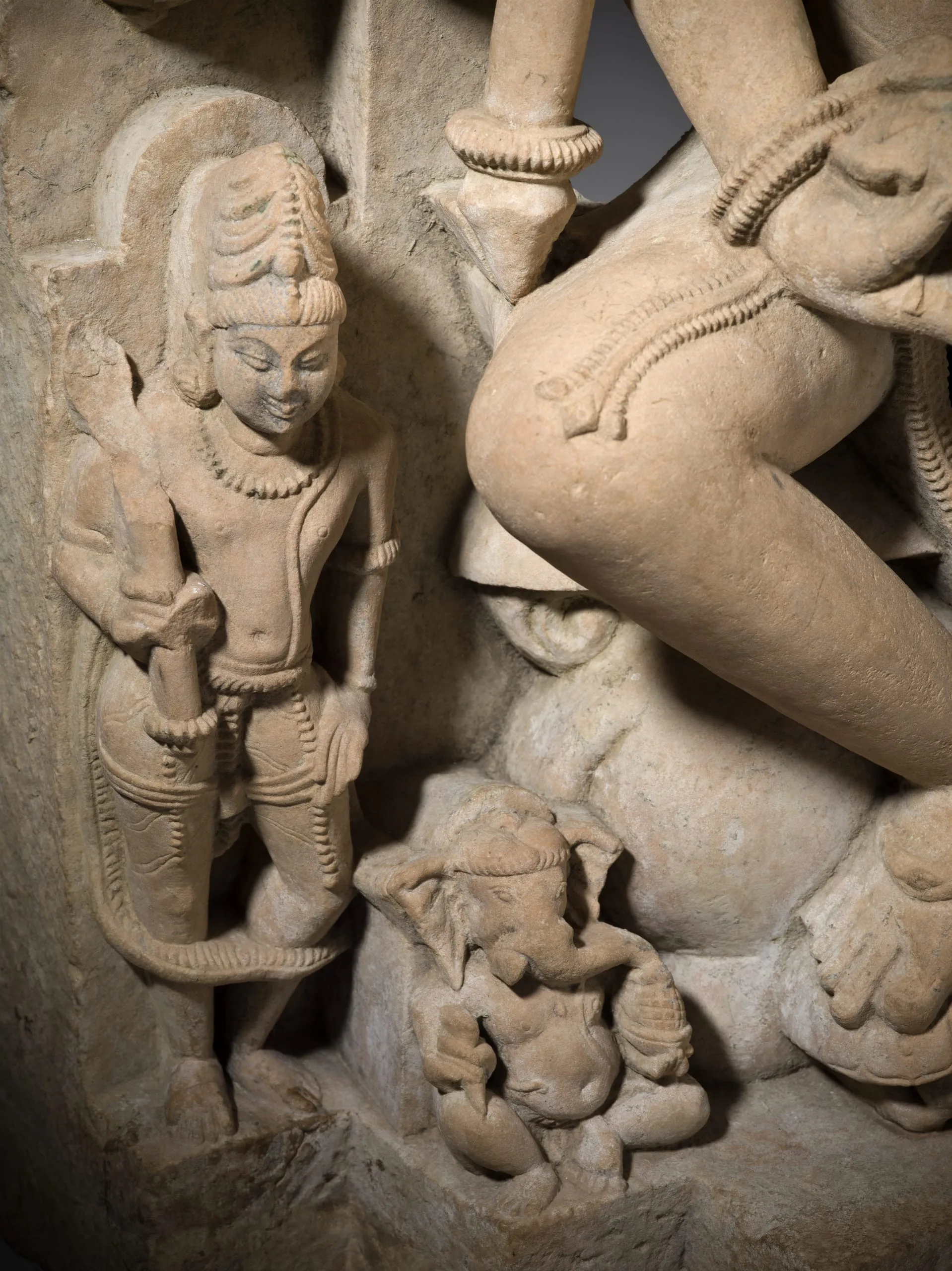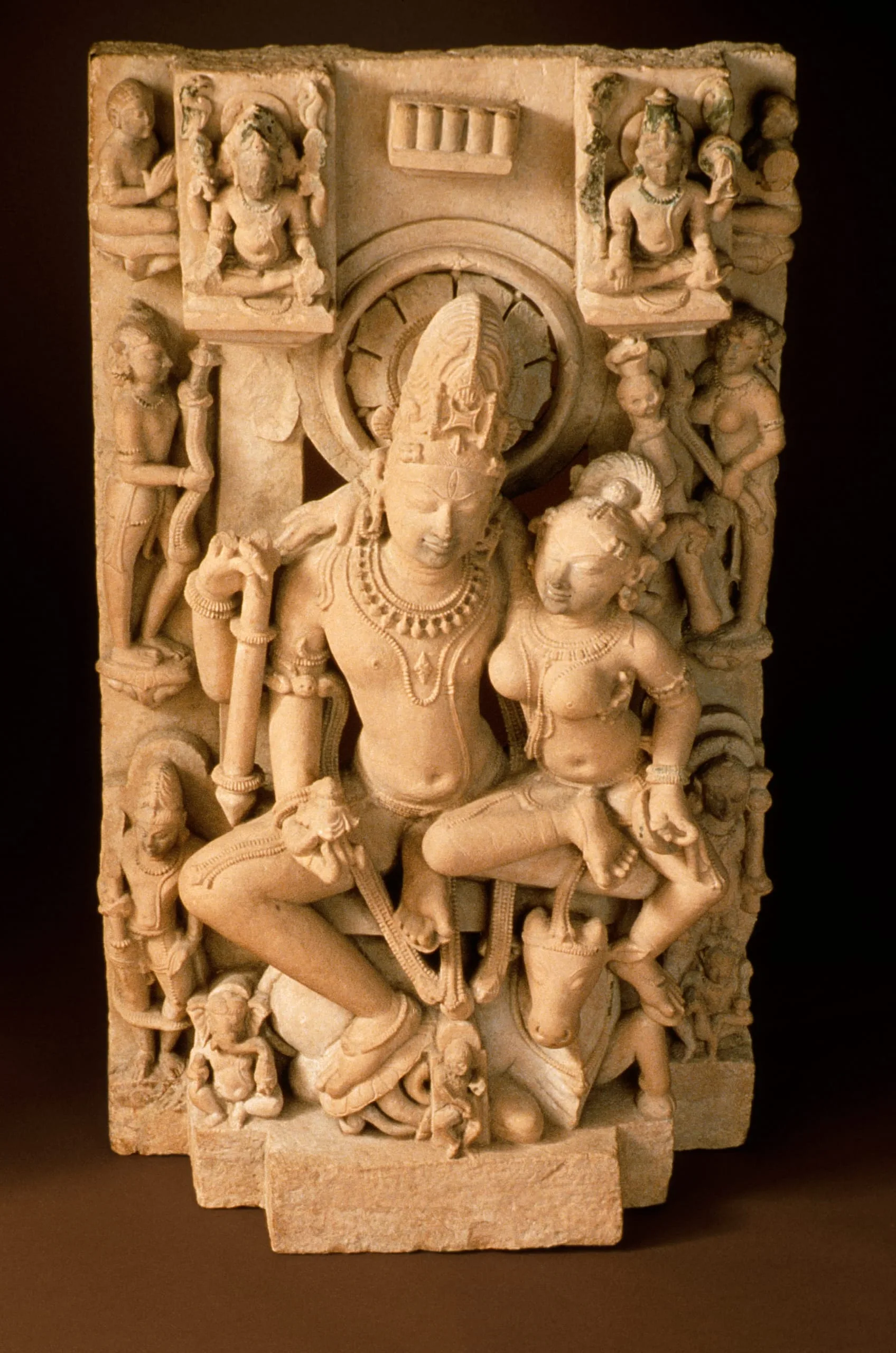 Shiva's bull mount, popularly called Nandi, is recumbent beneath the gods. Shiva's favorite attendant, the skeletal Bhringi, dances in front of the bull, and their two sons, the elephant-headed Ganesha and the peacock-riding Kumara, sit at either side. Several attendants are also present. Along the top are the three-headed creator god Brahma and the god of preservation, Vishnu, deities who with Shiva form the Hindu trinity. Between them are five lingas (aniconic/phallic symbol of Shiva) symbolizing the five philosophical aspects of Shiva.