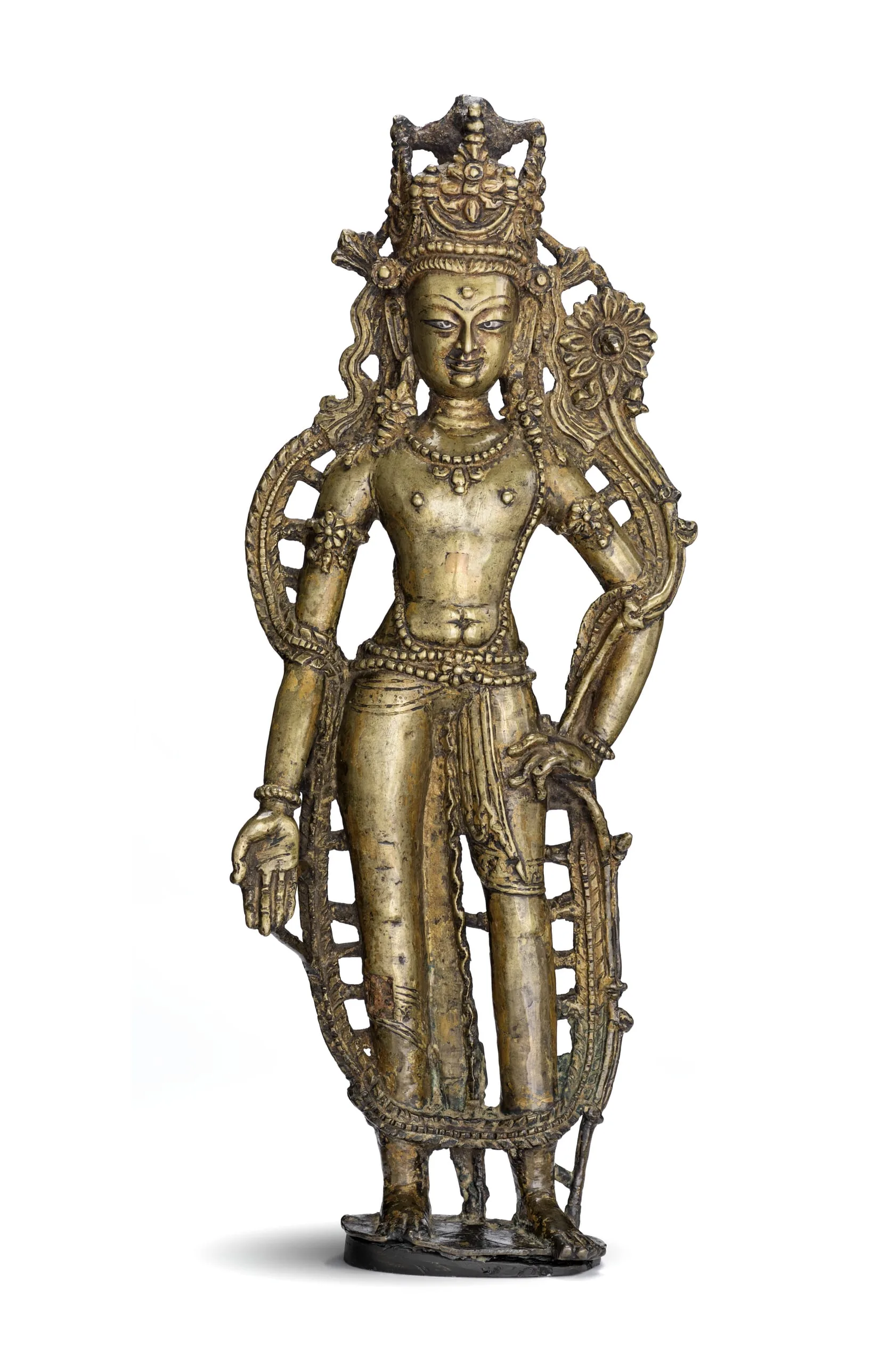 This representation of Avalokiteshvara, the Bodhisattva of Compassion, stands on a base plate that was once attached to a lotus base. He has a third eye in his forehead, silver-inlaid eyes, and copper-inlaid lips. He wears a tripartite crown and abundant ornaments, including the Brahmanical sacred thread (yajnopavita) over his left shoulder and a long floral garland (vanamala) around his neck that hangs down to his ankles. He is bare chested, barefooted, and wears a plain dhoti with decorated borders. In his left hand he holds a blossoming lotus with a long stalk. The back is roughly finished with multiple casting sprues remaining that function as support struts.