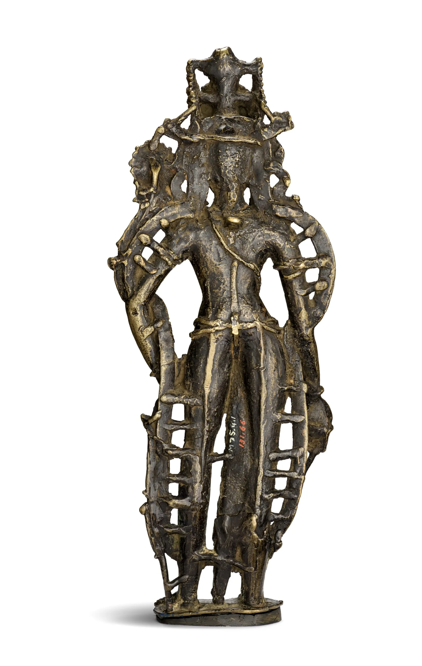 - Leaded copper-zinc-tin alloy inlaid with silver and copper; traces of paint