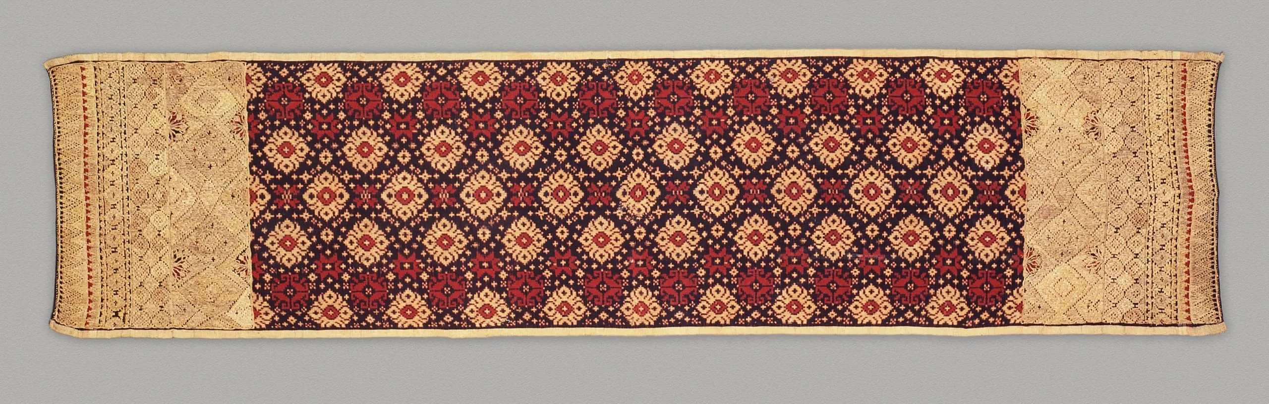 - Cotton plain weave with couched metallic-thread embroidery, tie-resist-dyed warp and weft (ikat)