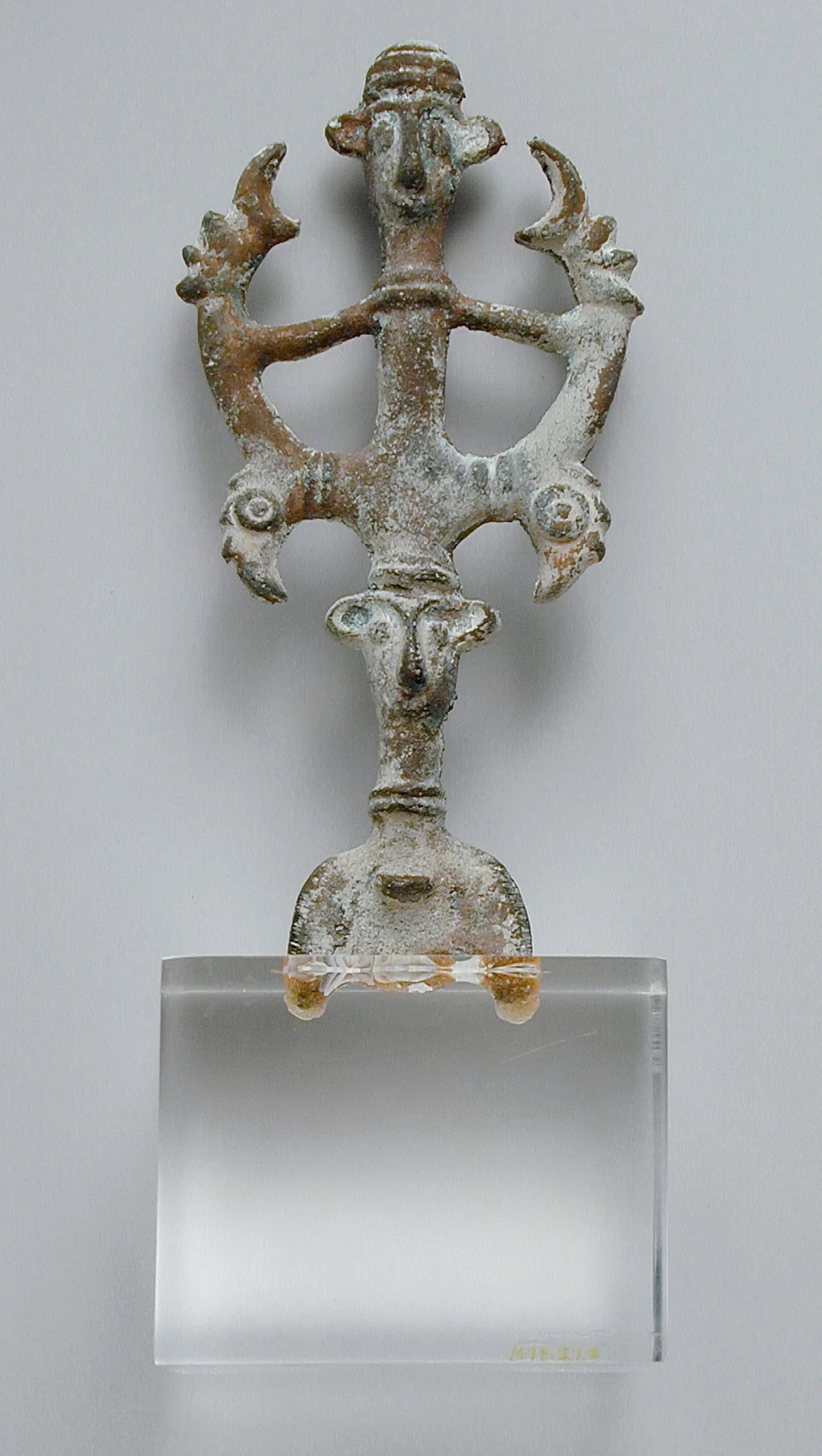 Small bronze pin or finial with heavy green-gray patina, featuring two faces and symmetrical bird-like creatures on a cross-shaped form, displayed in a clear acrylic stand
