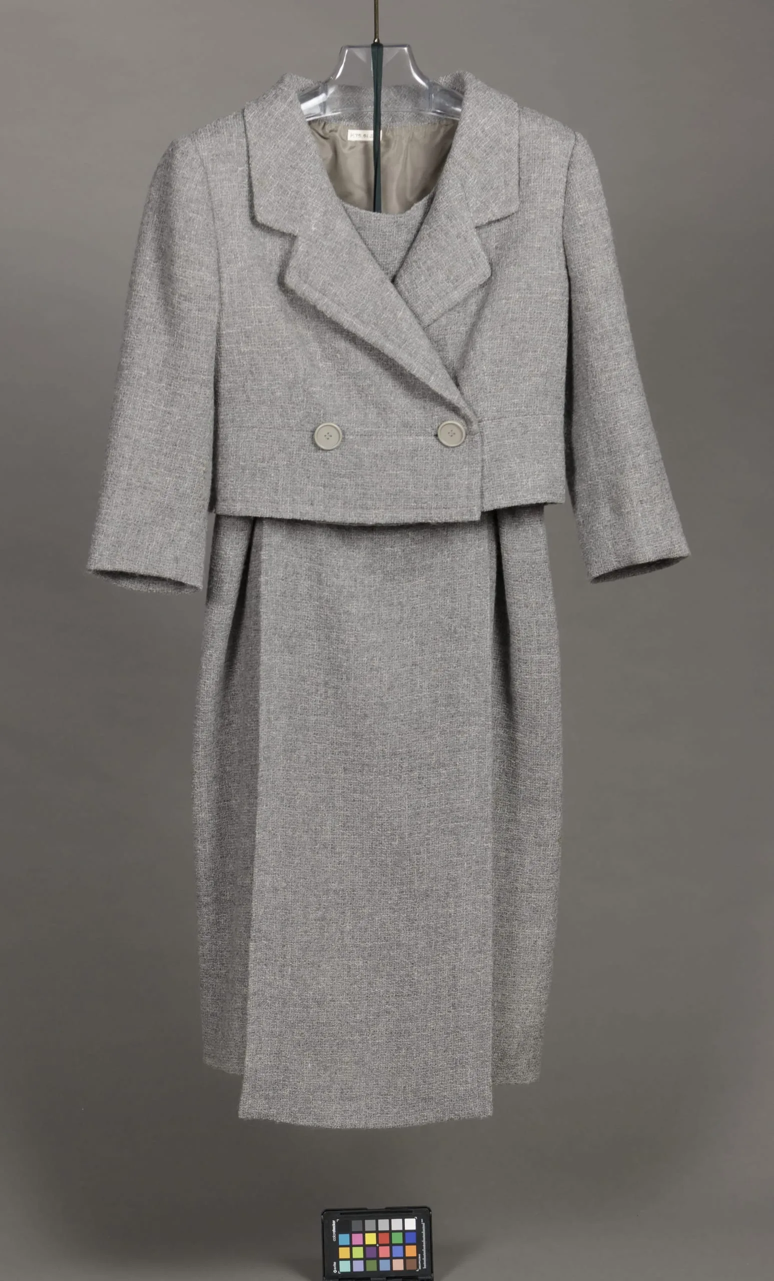 - Jacket and Blouse: wool plain weave (crepe) with plastic buttons. Skirt: wool plain weave (crepe).