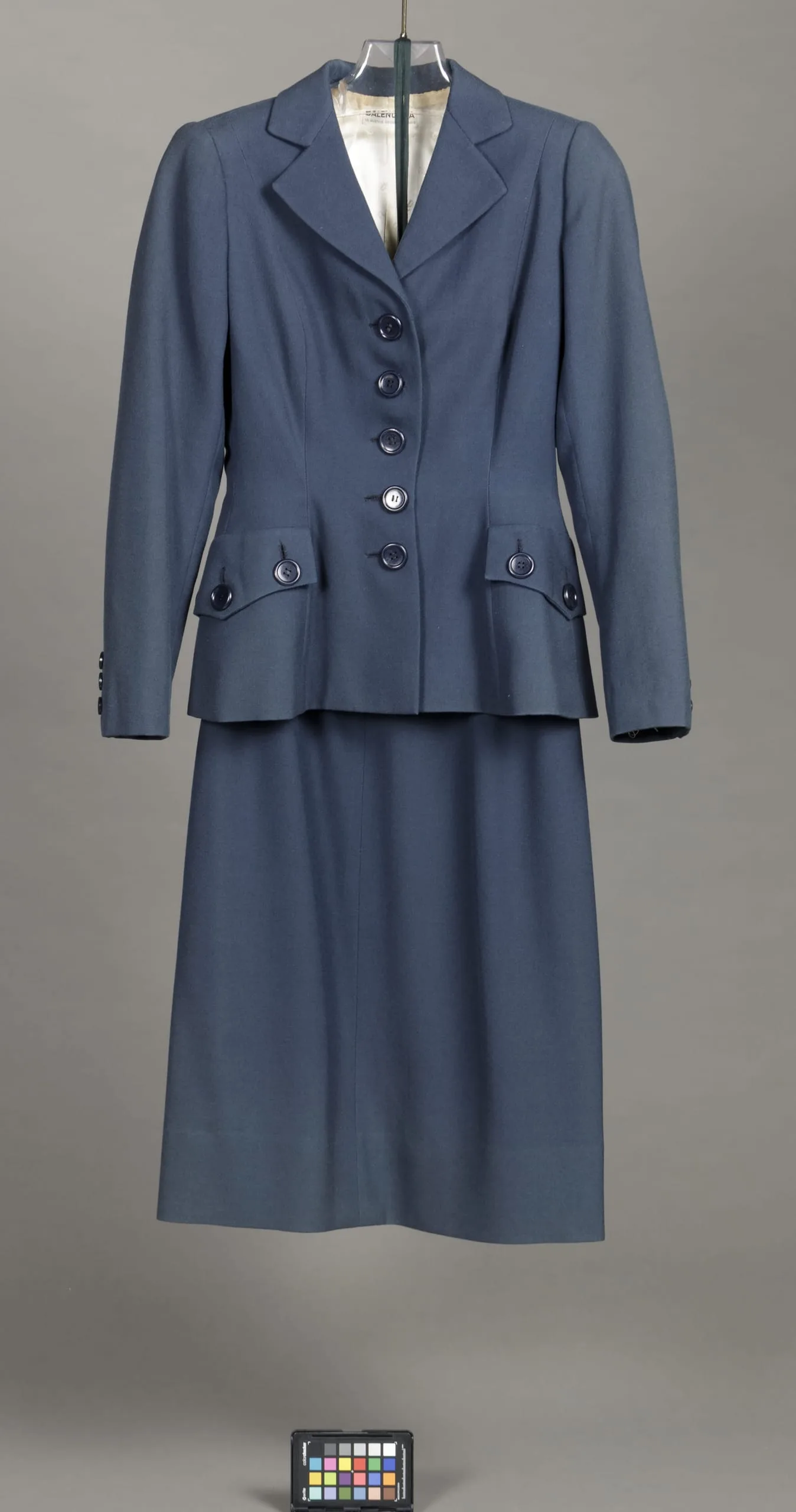 - Jacket: wool plain weave with plastic buttons; Skirt: wool plain weave.