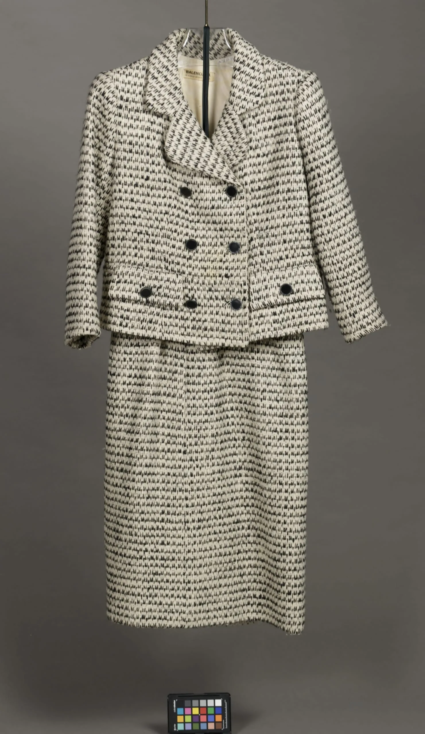 - Jacket: wool plain weave, leather and metal buttons. Skirt: wool plain weave.