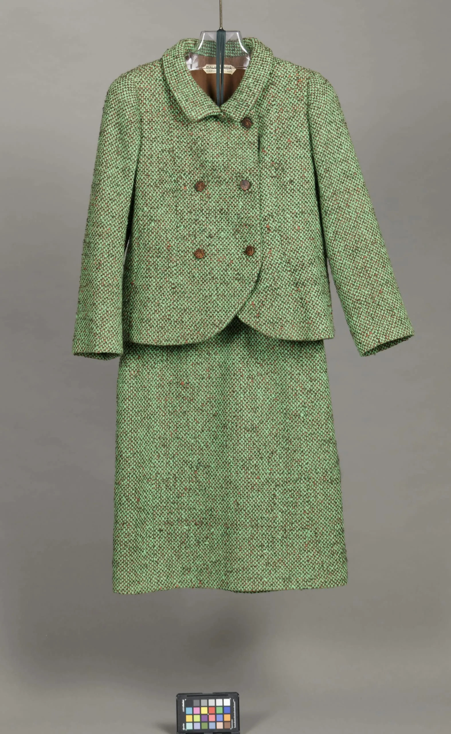 - Jacket: wool plain weave, wood buttons. Skirt: wool plain weave.