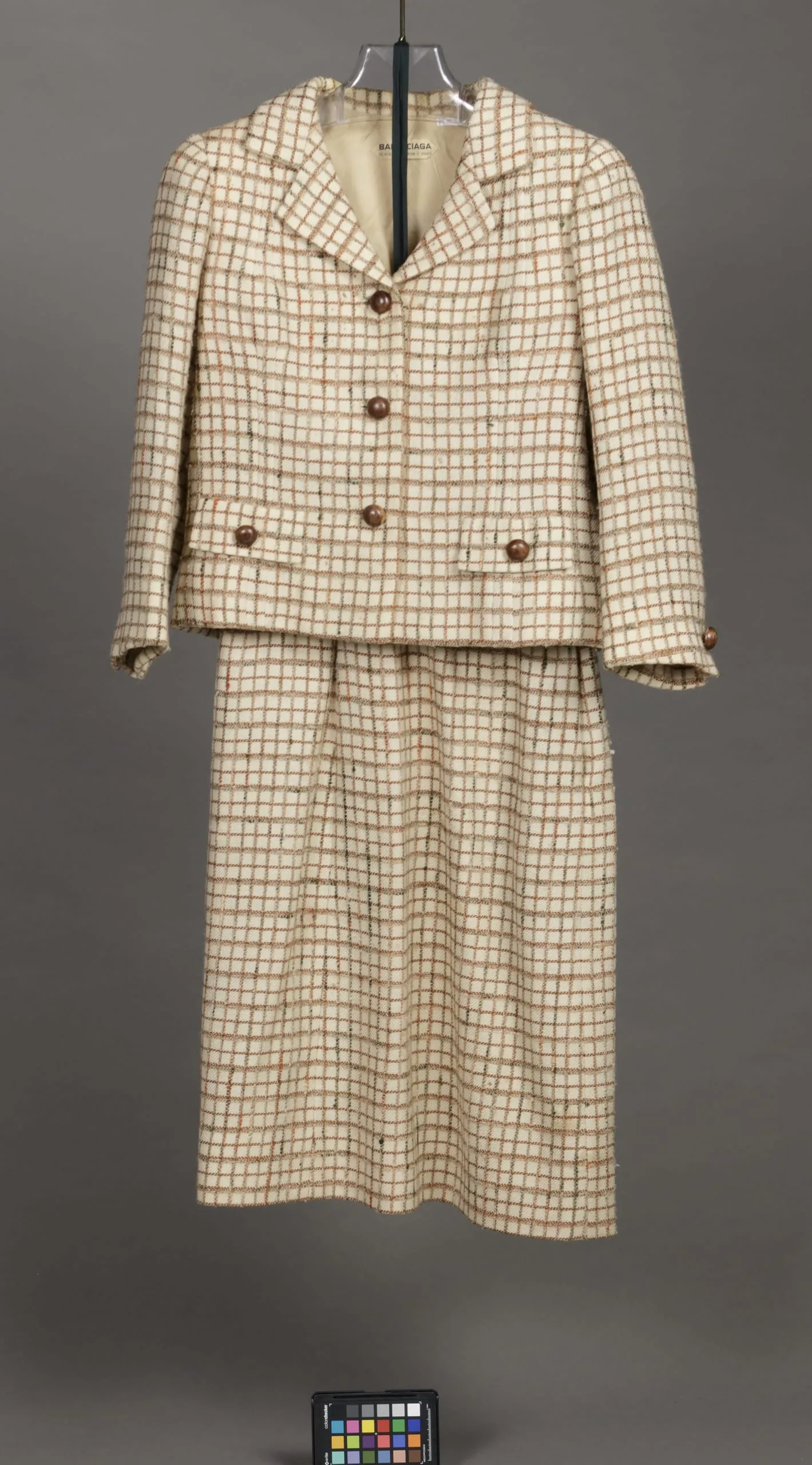 - Jacket: wool twill with supplementary warp and weft patterning, with wood buttons; Skirt: wool twill with supplementary warp and weft patterning