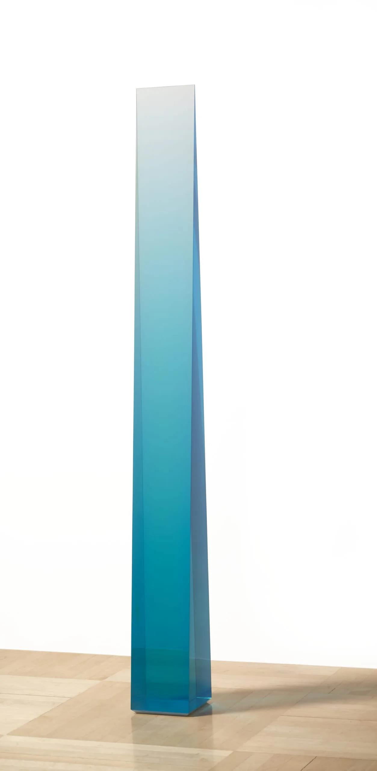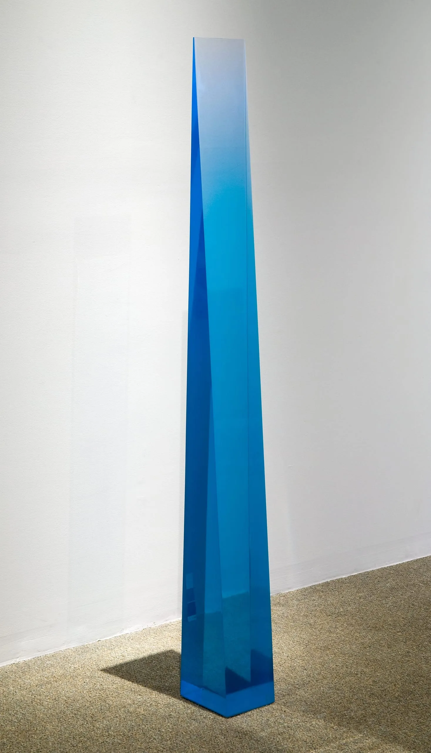 Peter Alexander came to polyester resin as a sculptural material through surfing, intrigued by the translucent, moldable nature of the liquid resin he used to glaze and repair his surfboard. He wanted viewers to become immersed in his sculptures, which he felt required a perfectly polished finish; any scratches or blemishes would be distracting. While Alexander’s smaller wedges (including the pink one in this exhibition) are colored uniformly, his taller wedges, such as this untitled 1968 work, are most highly colored at the bottom, fading to a mere hint of coloration at the razor-thin top edge. This was inspired by Alexander’s experience of looking down on the coastline from an airplane, seeing how the color of the water appeared to lighten as the plane approached the shore.