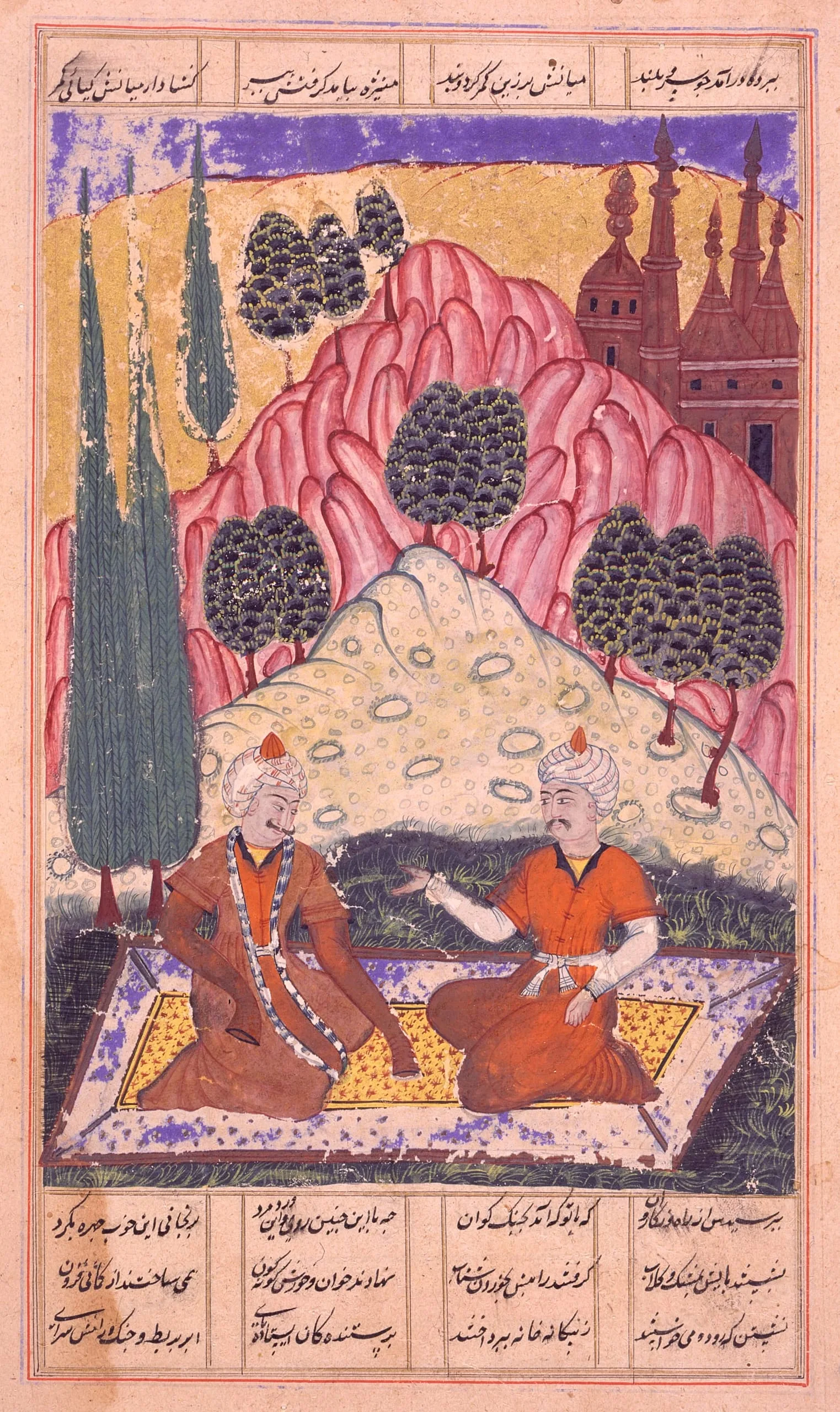 This folio illustrates a meeting of Gorgin and Bizhan, two legendary early Iranian heroes who had been tasked with killing all the wild boars in nearby Armenia. After Bizhan eradicated the boars alone, he met with the jealous Gorgin who leads him astray by infatuating him with tales of the beautiful women and gardens of the legendary kingdom of Turan by the Caspian Sea in Central Asia. Bizhan goes to Turan and falls in love with Manizhe (or Manijeh), the beautiful daughter of mythical king of Turan, Afrasiyab (or Afrasiab). Their affair is discovered by Afrasiyab, who banishes them into separate exiles. Eventually, they are reunited and rescued by the heroic Rustam sent by the Shah of Iran, Kay Khusraw (or Khosrow).