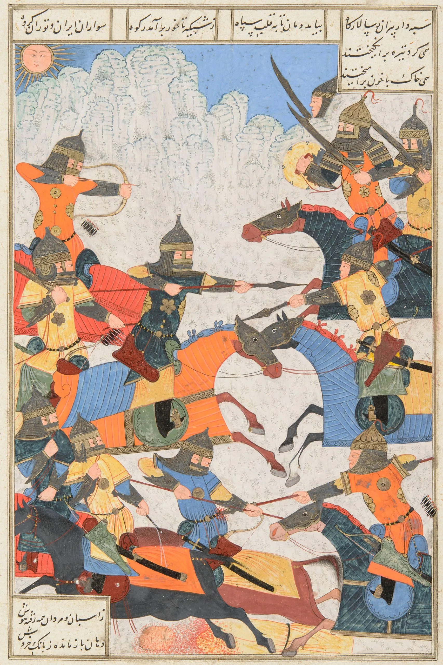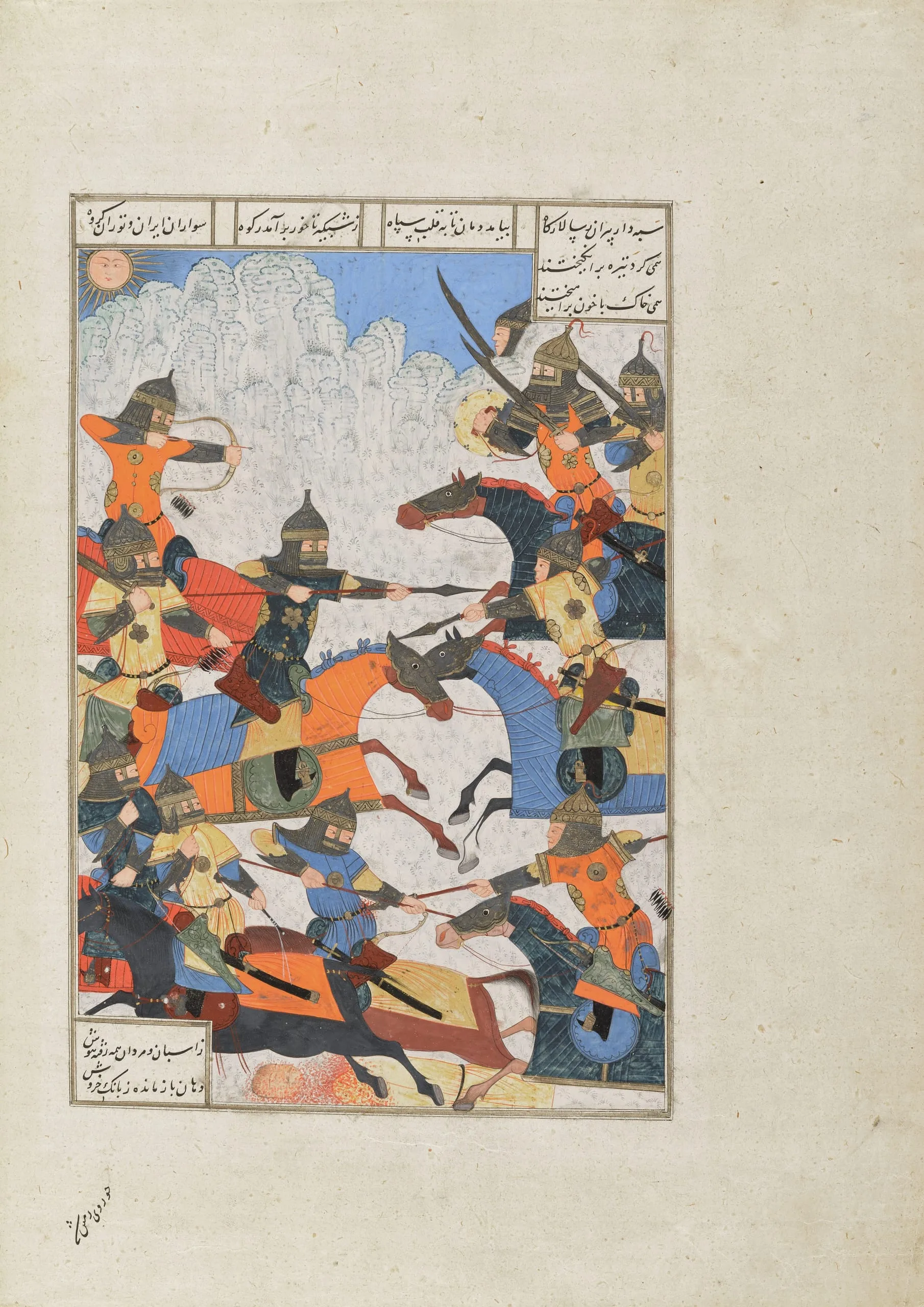 Battle is a major theme of the Shahnama (Book of Kings), the Iranian national epic, which tells of the pre-Islamic kings, whose reigns are often punctuated by warfare, and the heroes who fight on their behalf. As this painting from a late fifteenth-century Shahnama manuscript demonstrates (also see M.85.237.71), illustrators rarely shied away from depicting the battlefield violence described throughout the poem. Here, Iranian and Turanian soldiers in the heat of pitched battle gallop over the corpse of a slain trooper as one soldier pierces the side of his enemy with a spear. Notably, the figures sport armor and weapons not of the epic’s ancient setting but of the period in which they were painted.
