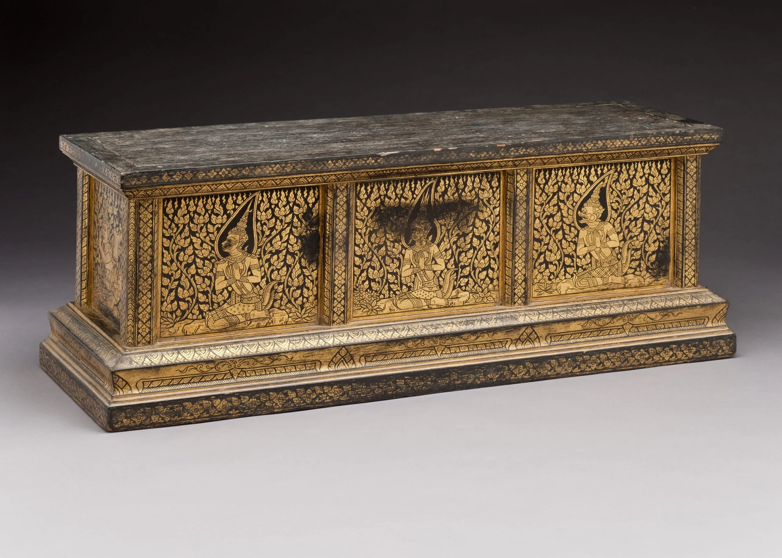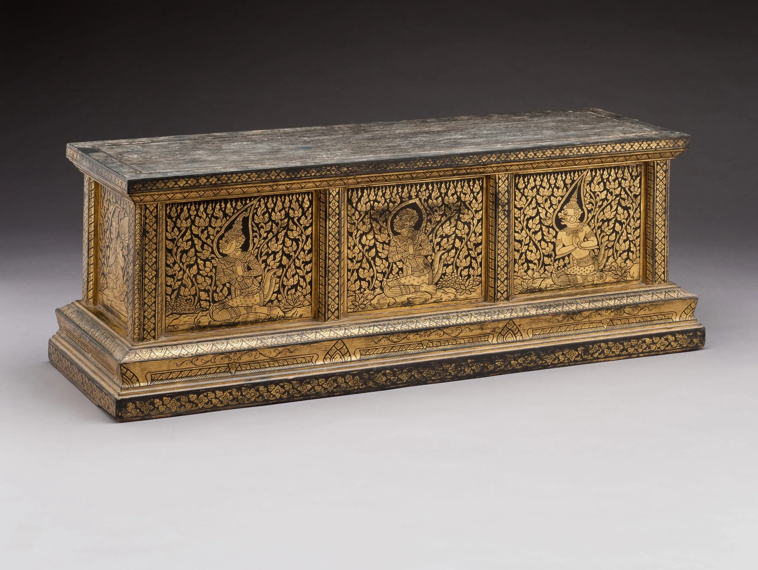 Sutra boxes were used to safeguard Buddhist manuscripts (sutras) as sacred objects when they are not being read by monks, viewed by visiting dignitaries, or serving as objects of ritual veneration. These ornate storage containers are often embellished with figural and geometric decoration, such as this example that depicts guardian deities and celestial worshippers amidst foliage with elaborate borders. Alternatively, they can be purely ornamental and devoid of figural decoration, such as M.86.188a-c.
