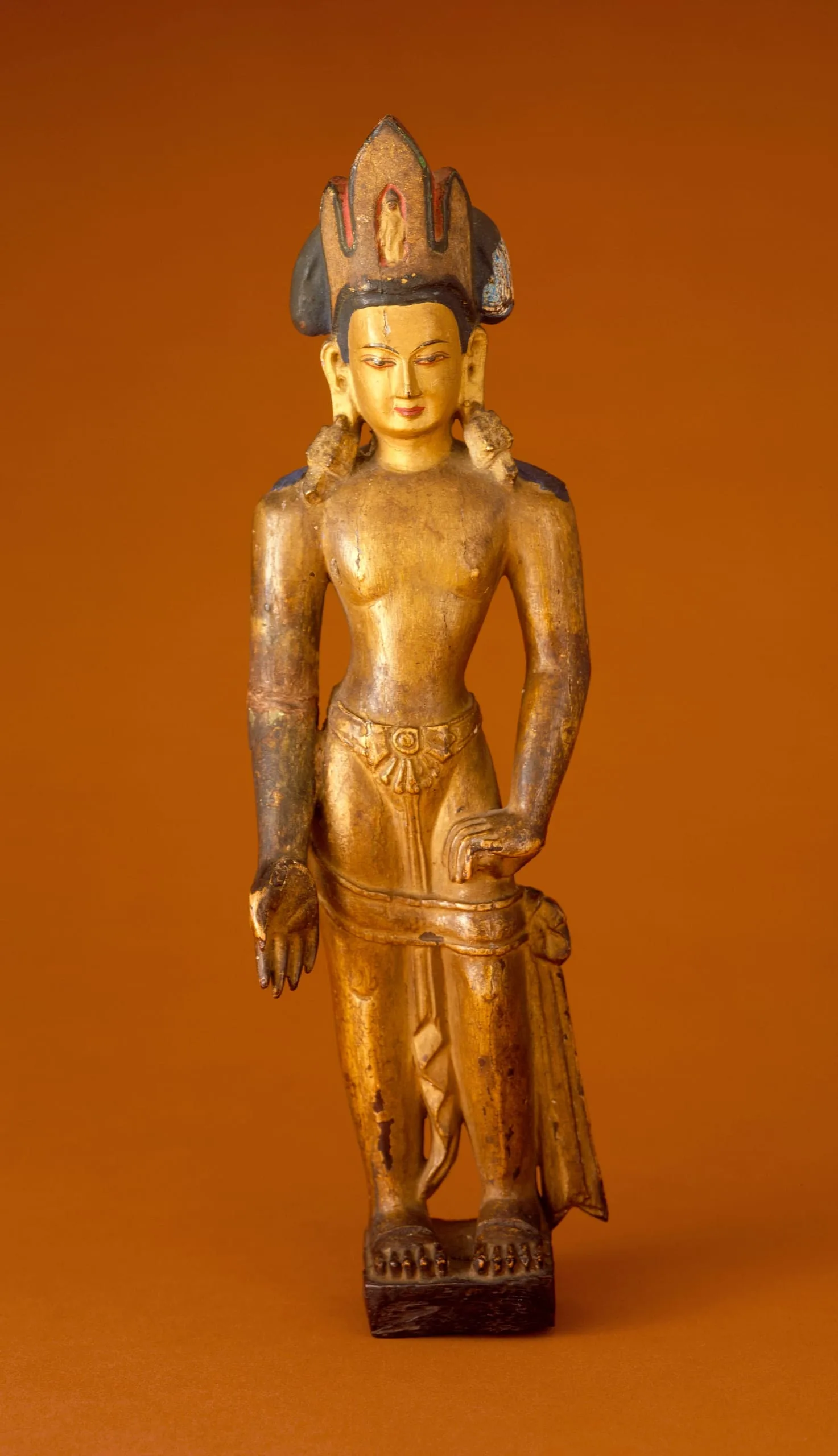 The bodhisattva wears a distinctive tripartite crown with a small forehead image (bimba) of a standing Jina Buddha, perhaps Ratnasambhava rather than Amitabha, Avalokiteshvara’s customary emanation source deity. He is two-armed with his right hand extended in the gesture of charity (varada mudra) and his left hand resting on his thigh. He wears unusual bell-shaped earrings.