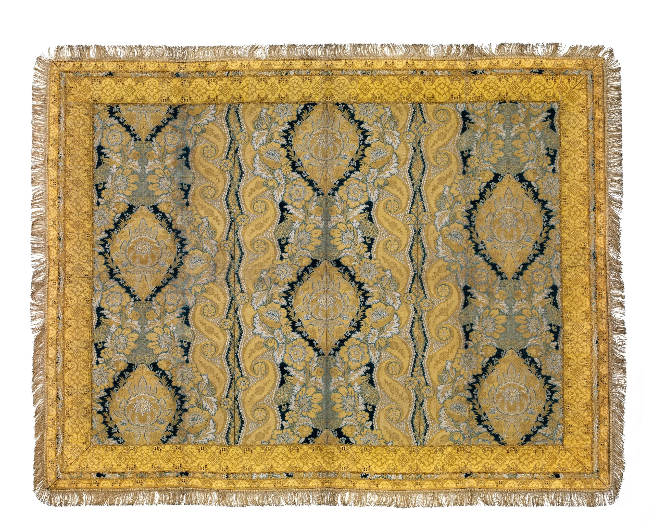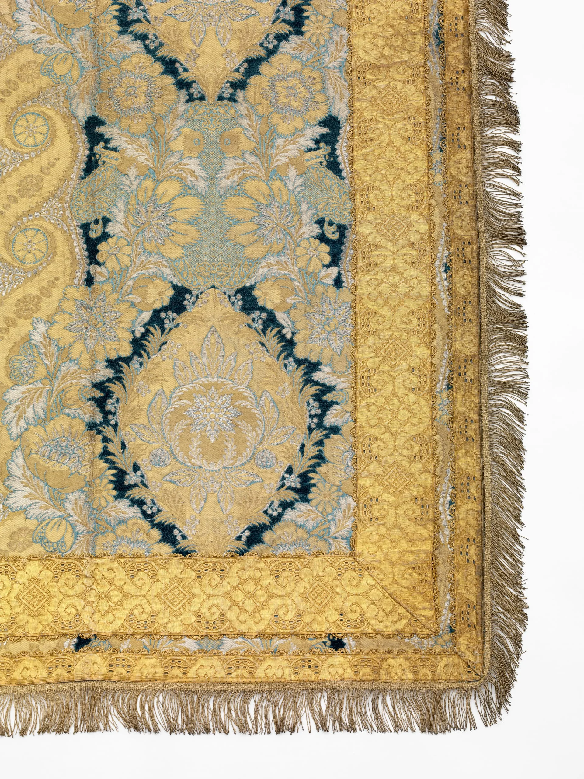 - Silk satin with silk and metallic thread supplementary-weft patterning bound in twill (lampas) and silk (chenille) and metallic thread discontinuous supplementary weft patterning (brocade) with metallic thread passementiere.