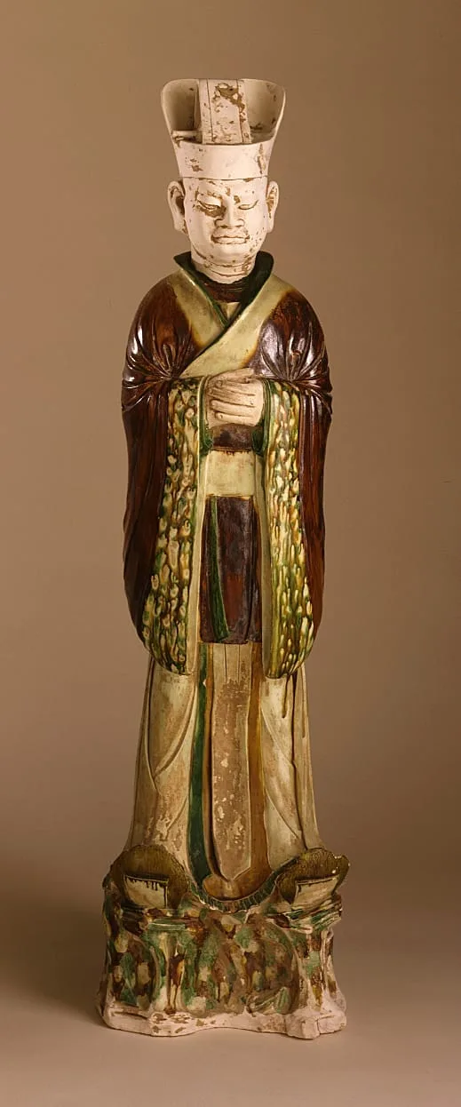 - Molded earthenware with incised decoration, polychrome (sancai) glaze, and traces of paint